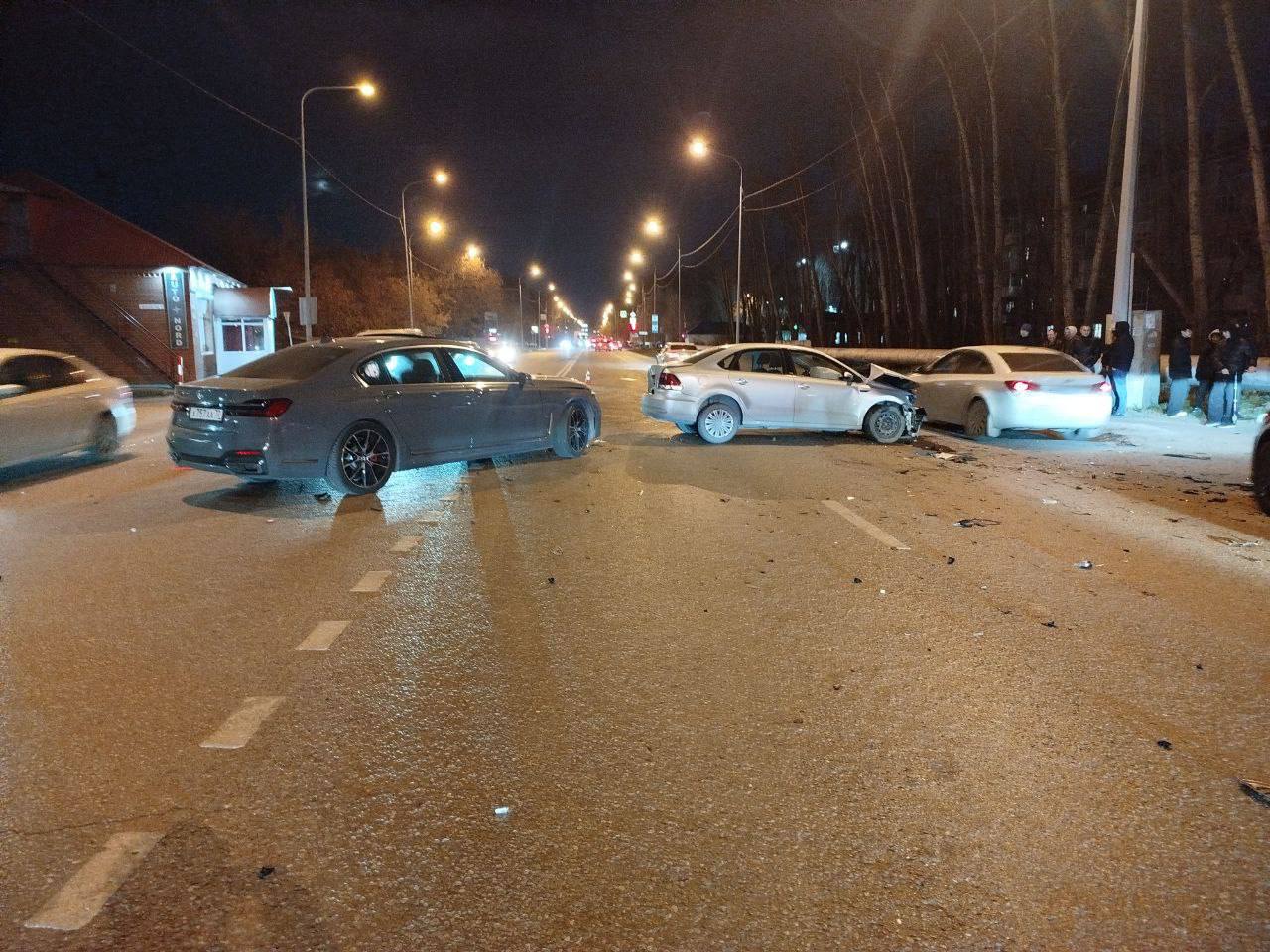 «Мазда», «Фольксваген» и «БМВ» столкнулись вчера вечером на улице Ветеранов труда д.5 в Тюмени.