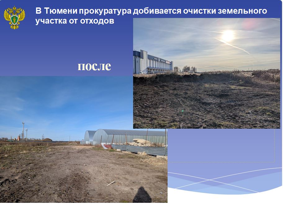Установлено, что на семи земельных участках в районе 9 км Велижанского тракта в Тюмени продолжительное время размещались отходы производства и потребления (куски бетона, доски,кирпичи, полиэтиленовые пакеты и т.д.).Прокуратура округа в судебном порядке обязала собственников очистить земельные участки от отходов производства и потребления.