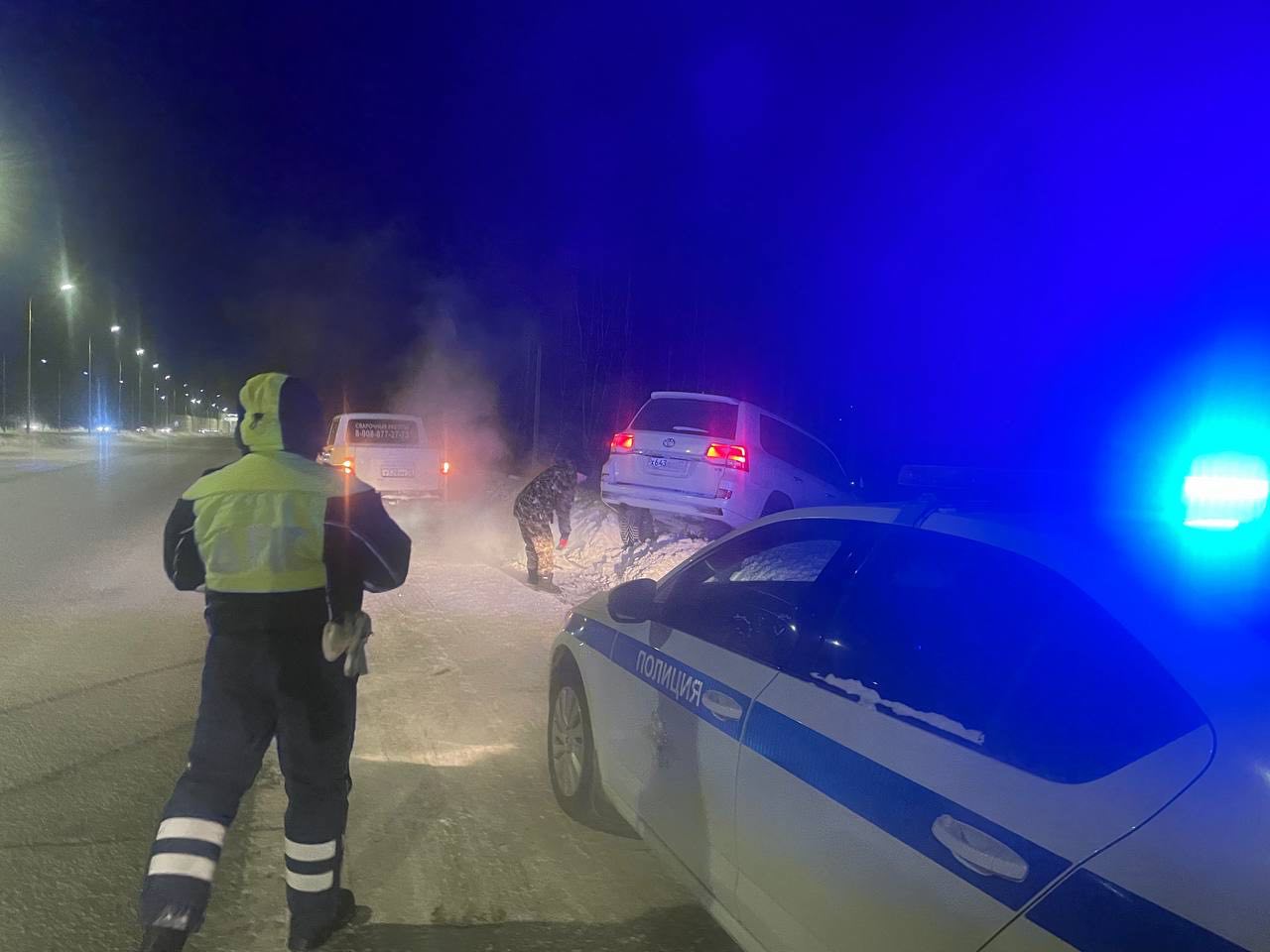 В сильный мороз инспекторы полка ДПС Госавтоинспекции помогли вытащить из кювета автомобиль "Тойота Лэнд Крузер": остановили подходящий попутных автомобиль и ограничили движение для обеспечения безопасности.