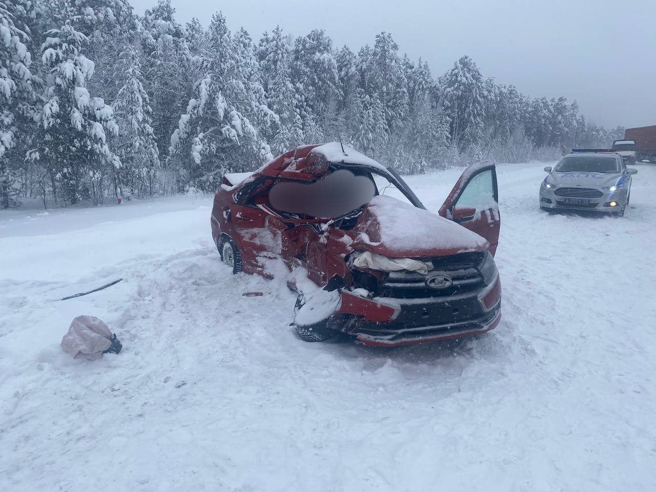 Здесь столкнулись большегруз "Вольво" и "лада Гранта" с номерами Югры. Предварительно, "Лада" выехала на встречную полосу.