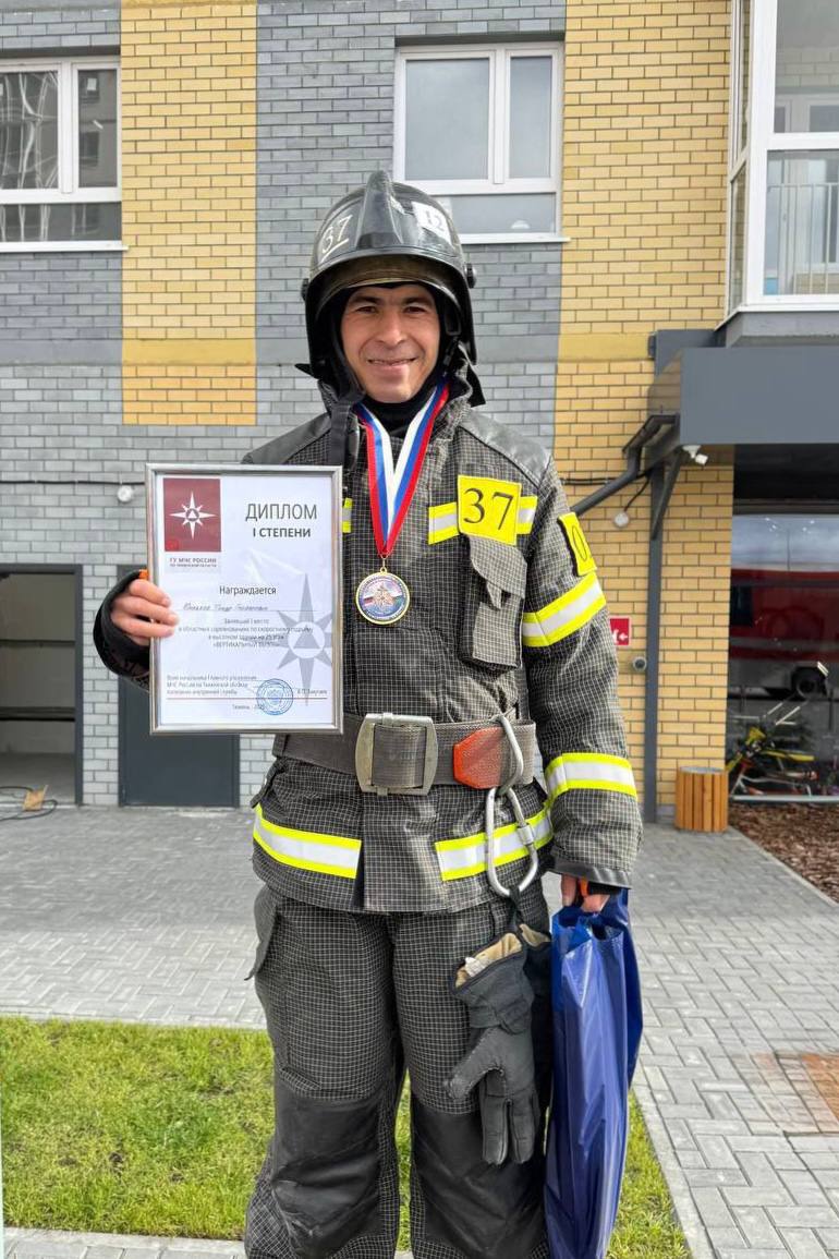 Глава города Петр Вагин поздравил Тимура Юмадеева с триумфальной победой: ""Поздравляю Тимура Юмадеева, командира отделения 37-й ПСЧ, который с поразительным результатом 3 минуты 24 секунды занял первое место! Подняться на 25-й этаж в полной боевой экипировке — это настоящий подвиг, требующий невероятной физической подготовки, выносливости и силы воли. Такой настрой и выучка — залог нашей с вами безопасности".