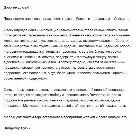 Президент России Владимир Путин поздравил россиян с Днем отца: «очень важно, чтобы сегодня мужчины, молодые люди стремились соответствовать этому высокому званию»