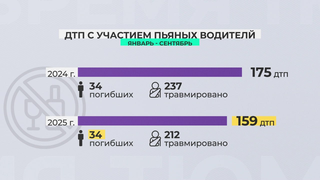 Госавтоинспекция отмечает рост погибших в ДТП с участием пьяных водителей. В этом году произошло 159 таких аварий, 34 человека погибли, 212 ранены.