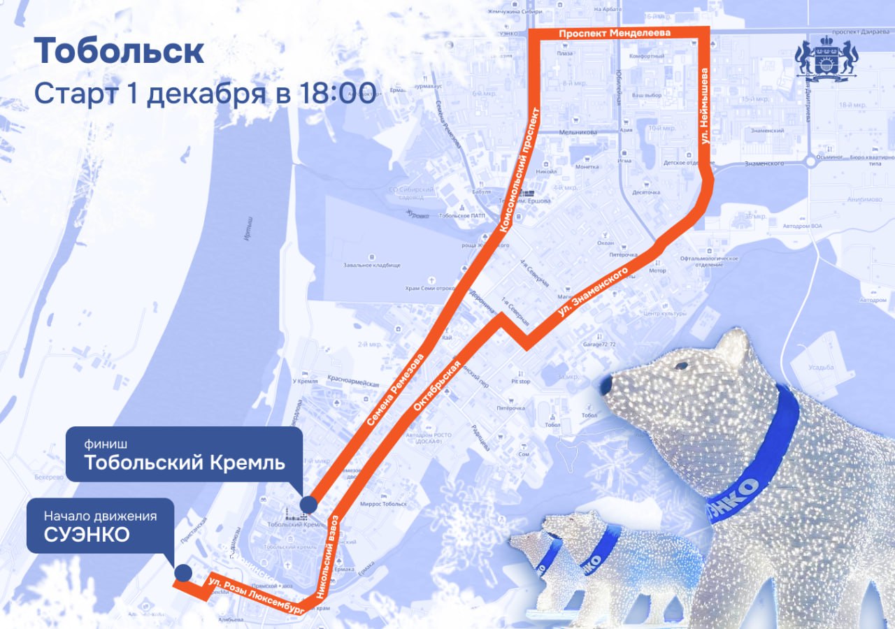 Затем эстафету примет Тобольск, где медвежий кортеж начнет свой путь 1 декабря в 18:00. А уже 2 декабря в 18:00 у Кремля состоится открытие4 праздничной инсталляции.