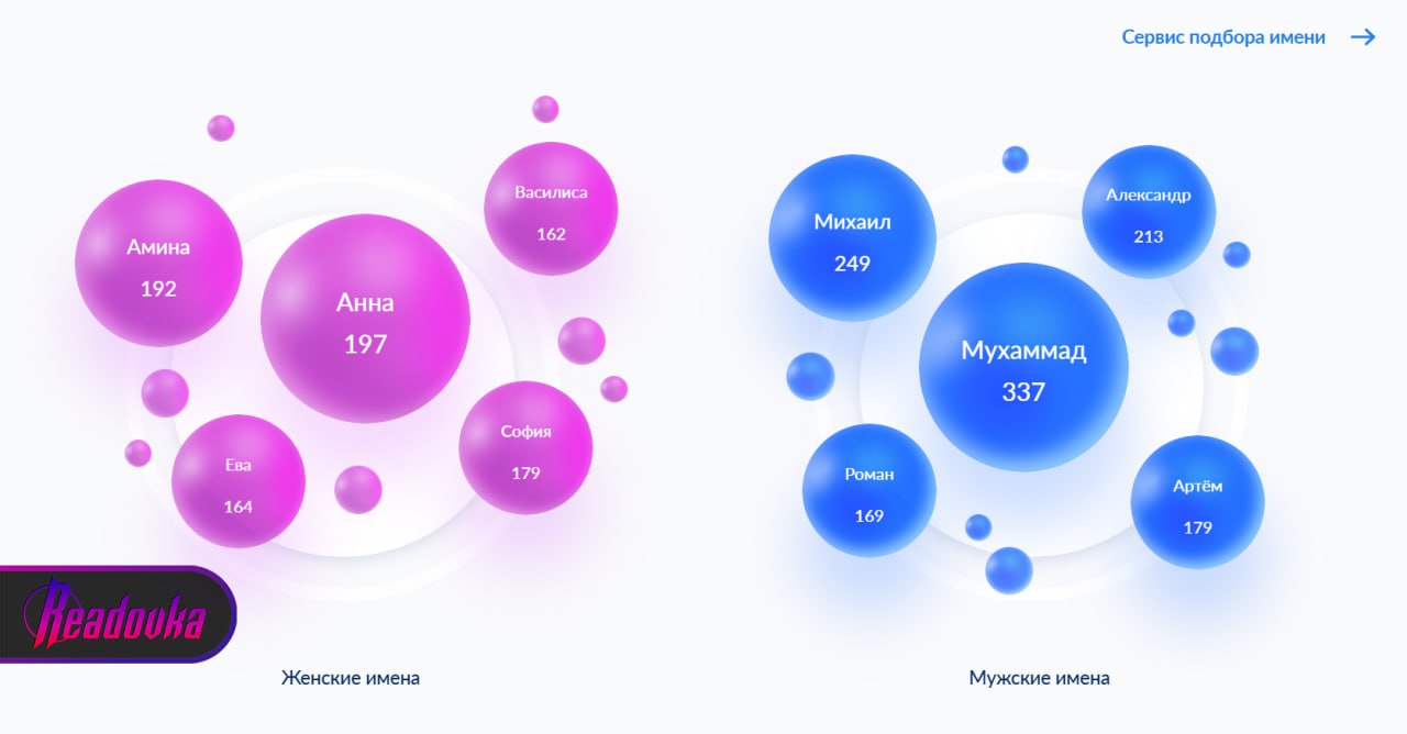 Арабская Сафия, вырвавшаяся в лидеры в июле, теперь выбыла из гонки — ее вытеснили 164 Евы. Среди мальчиков без перемен, уже четыре года абсолютное лидерство удерживает Мухаммад — в этом месяце родилось 337 детей с этим именем. Михаилам (249), Александрам (213) и Артемам (179) еще предстоит постараться, чтобы вернуть себе первое место.
