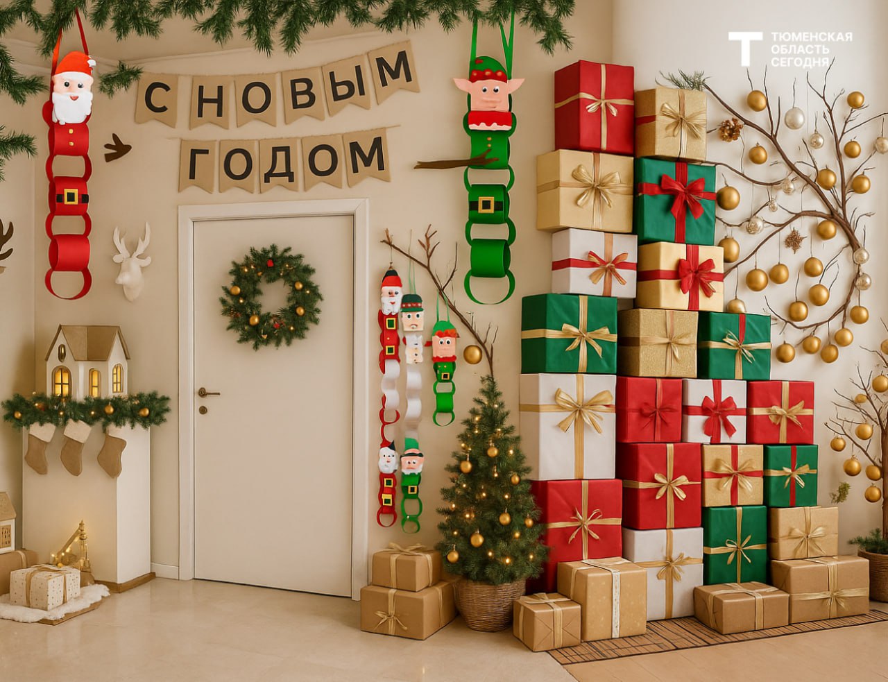 1. Сделать гирлянду из бумажных колец. Можно прикрепить к ним мордочки новогодних персонажей.2. Упаковать коробки в подарочную бумагу и украсить ими стену.