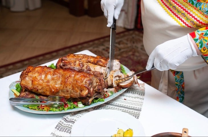 Главным украшением новогоднего стола в заведении станет фаршированный поросенок с полбой.
