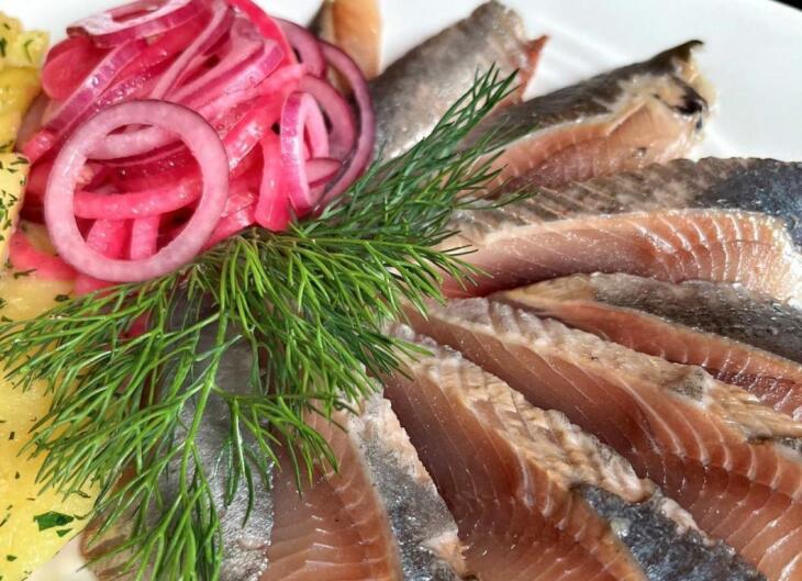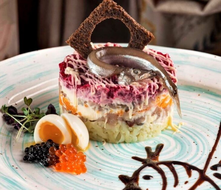 В сельдь под шубой повара добавят щучью икру, уложив ее в два слоя, а сверху украсят блюдо ржаными чипсами и живописной аппетитной килькой.
