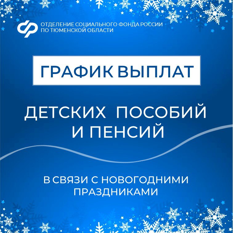 Отделение Социального фонда России по Тюменской области сообщает, что в связи с тем, что в январе дни зачисления детских пособий и пенсий приходятся на выходные, график выплат был скорректирован.