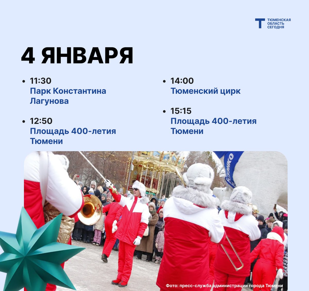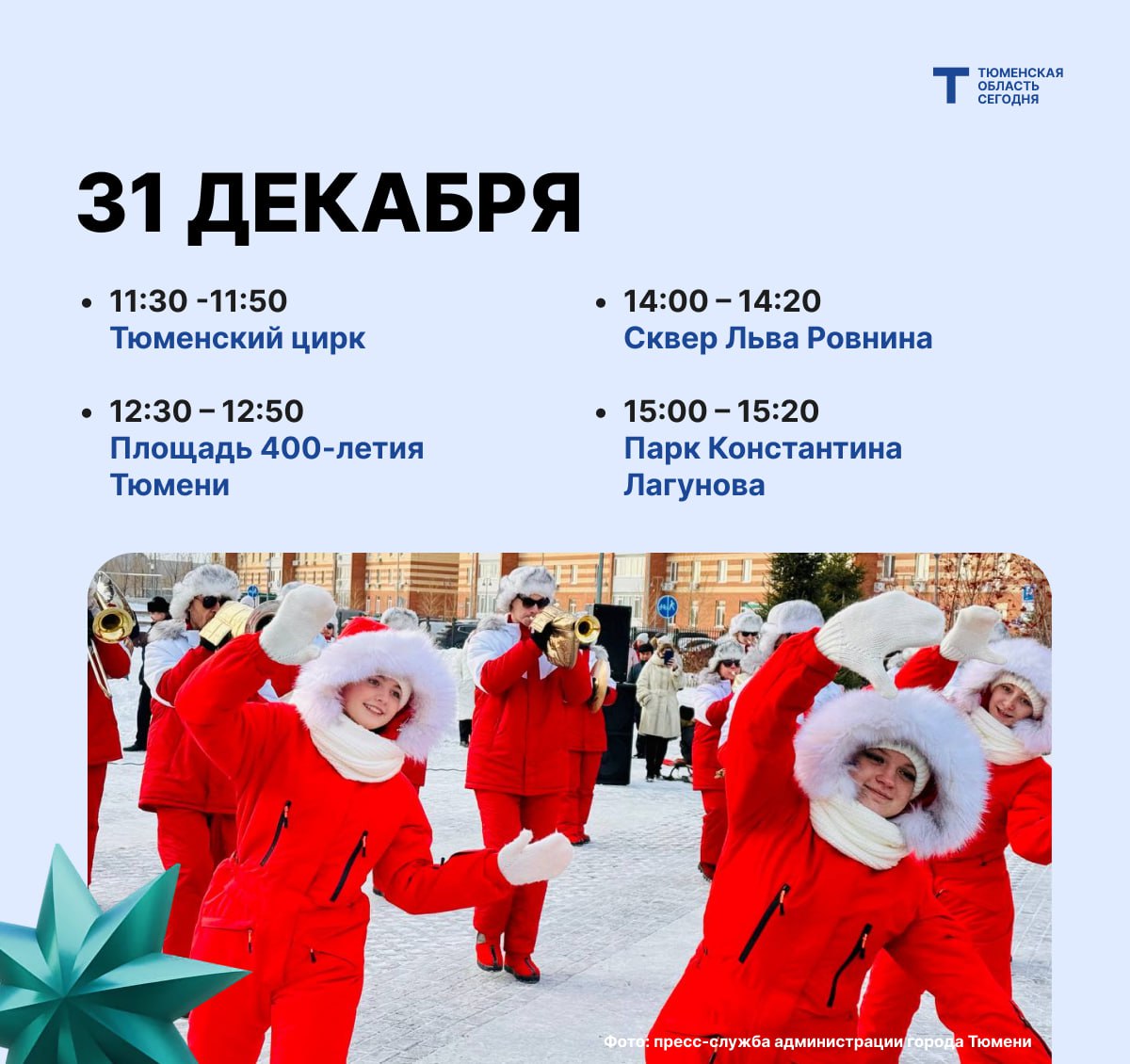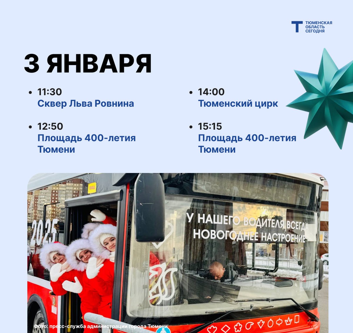 С 31 декабря по 4 января по улицам города будет курсировать особенный музыкальный автобус. Вместе с артистами Тюменского духового оркестра он подарит жителям праздничное настроение и любимые новогодние мелодии.
