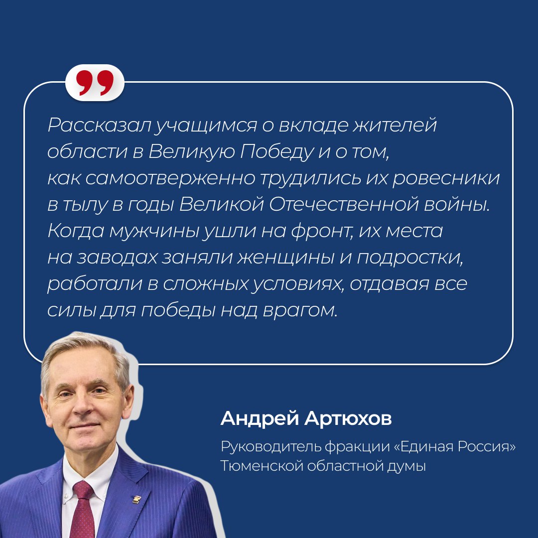 Патриотические уроки «Разговоры о важном» проводят для молодежи. Учащимся рассказывают о вкладе жителей региона в Великую Победу, а также о реализации проекта «Оружие Победы», в рамках которого в Тюменской области появляются уникальные памятники.