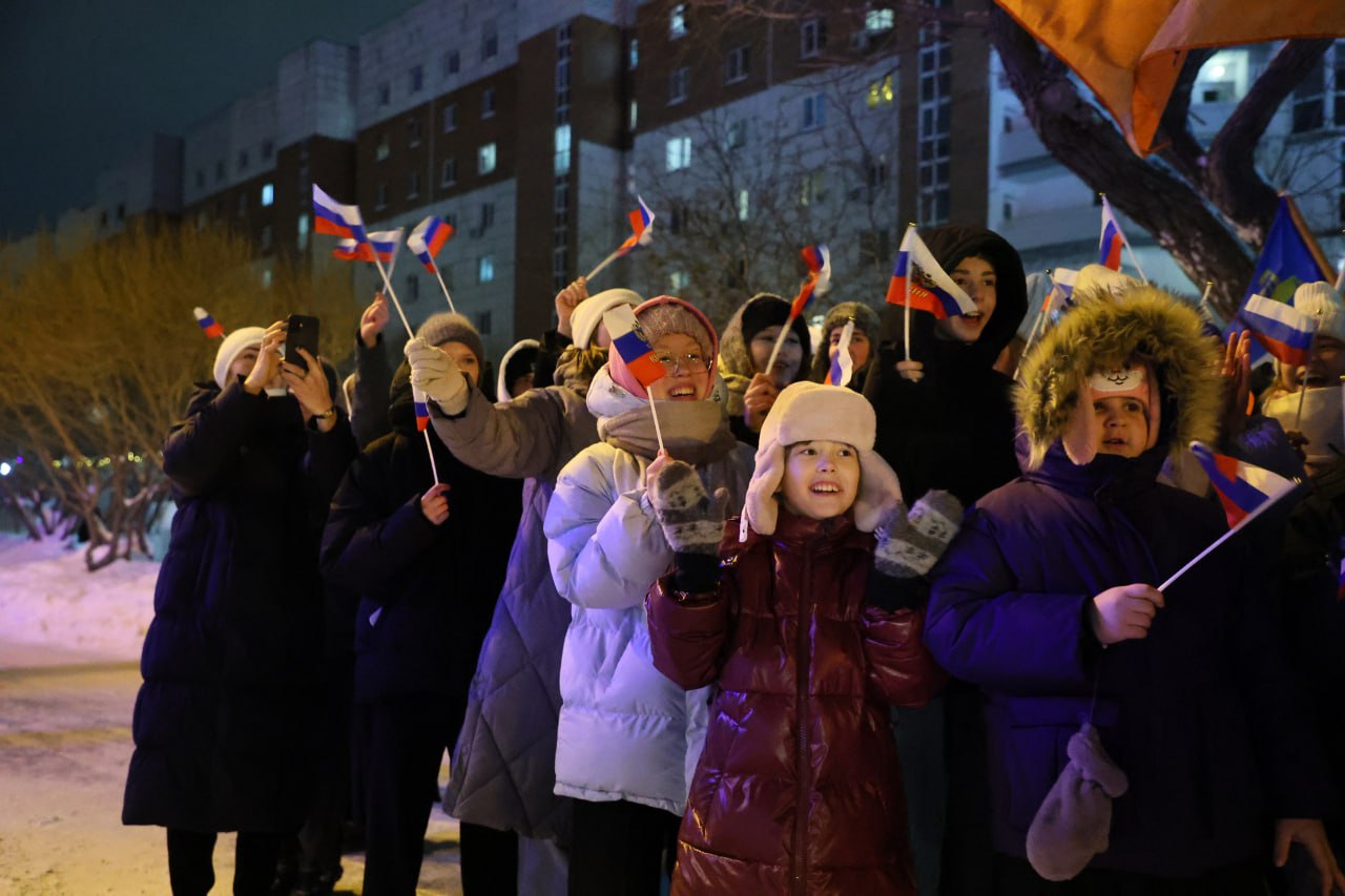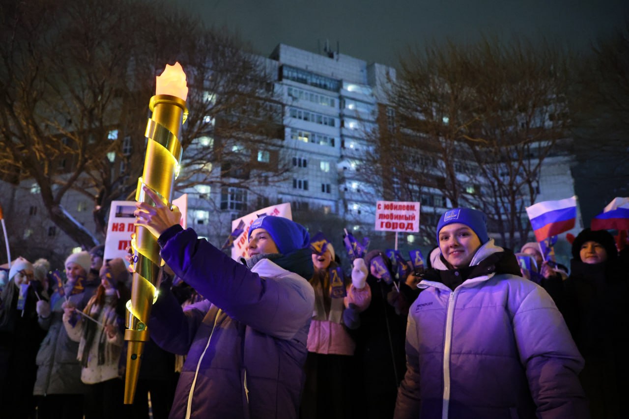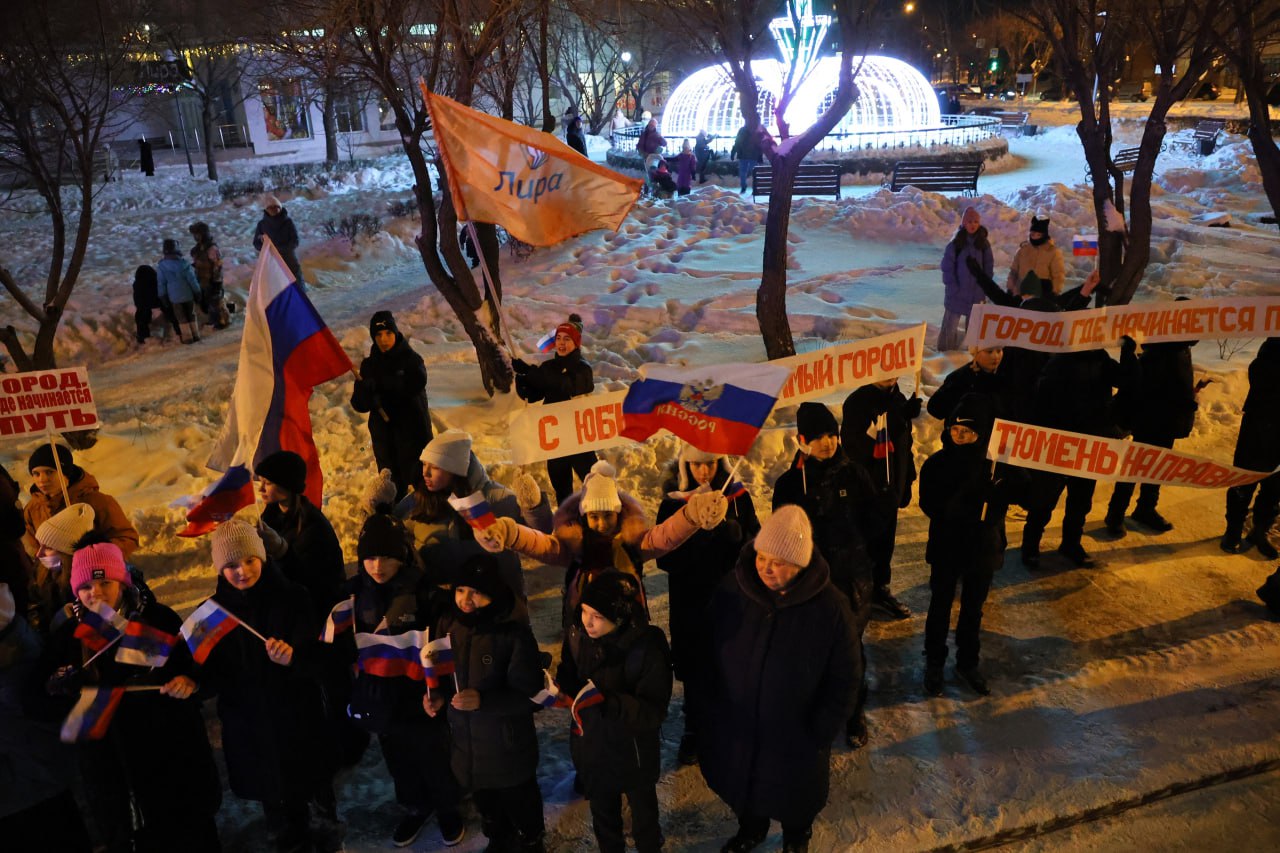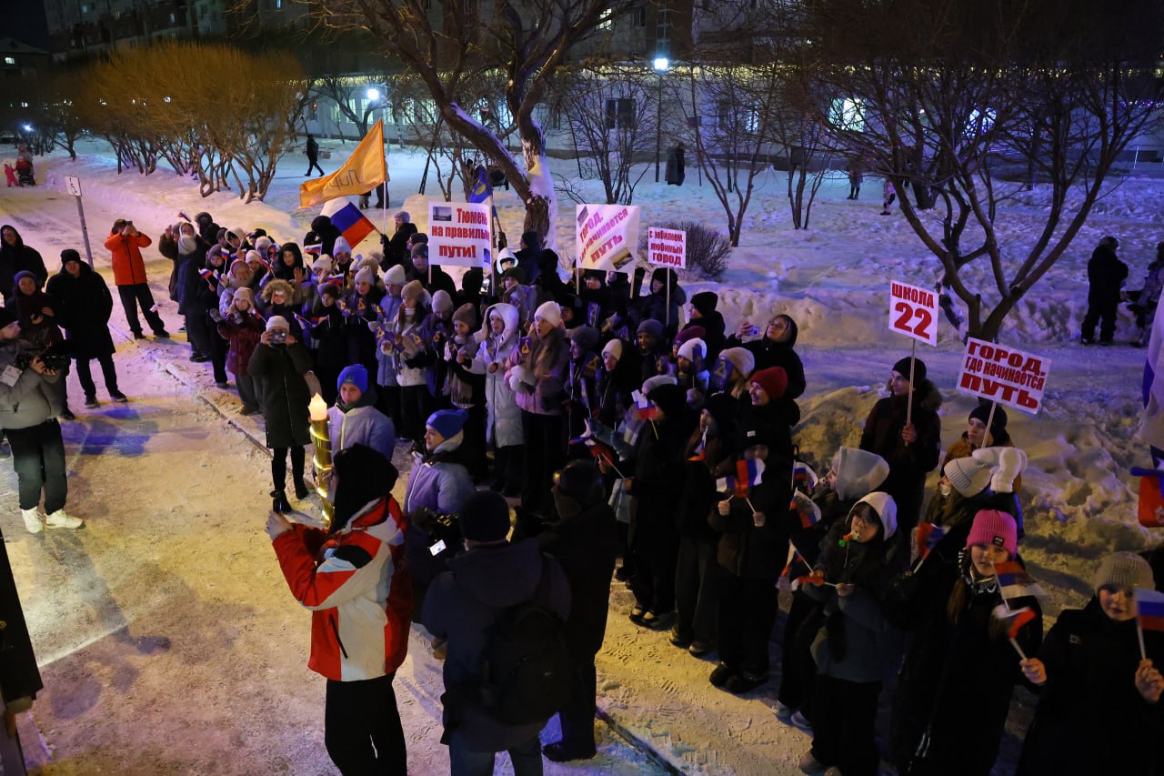 Там брендированный красный двухэтажный автобус встретила мощная группа поддержки! Более 60 человек из школ № 73 «Лира» и № 22 задорно – флагами и дудками – приветствовали группу сопровождения факела. «Тюмень на правильном пути», «Город, где начинается путь», «С юбилеем, любимый город» – вместе с ребятами «скандировали» плакаты.