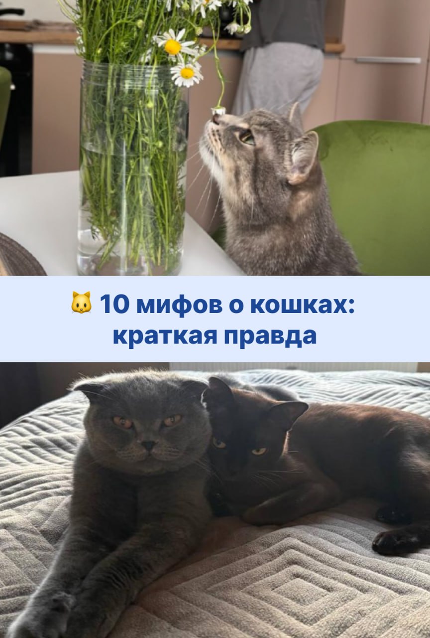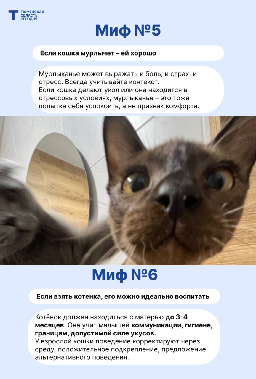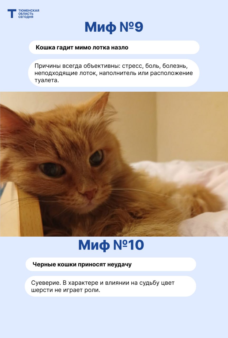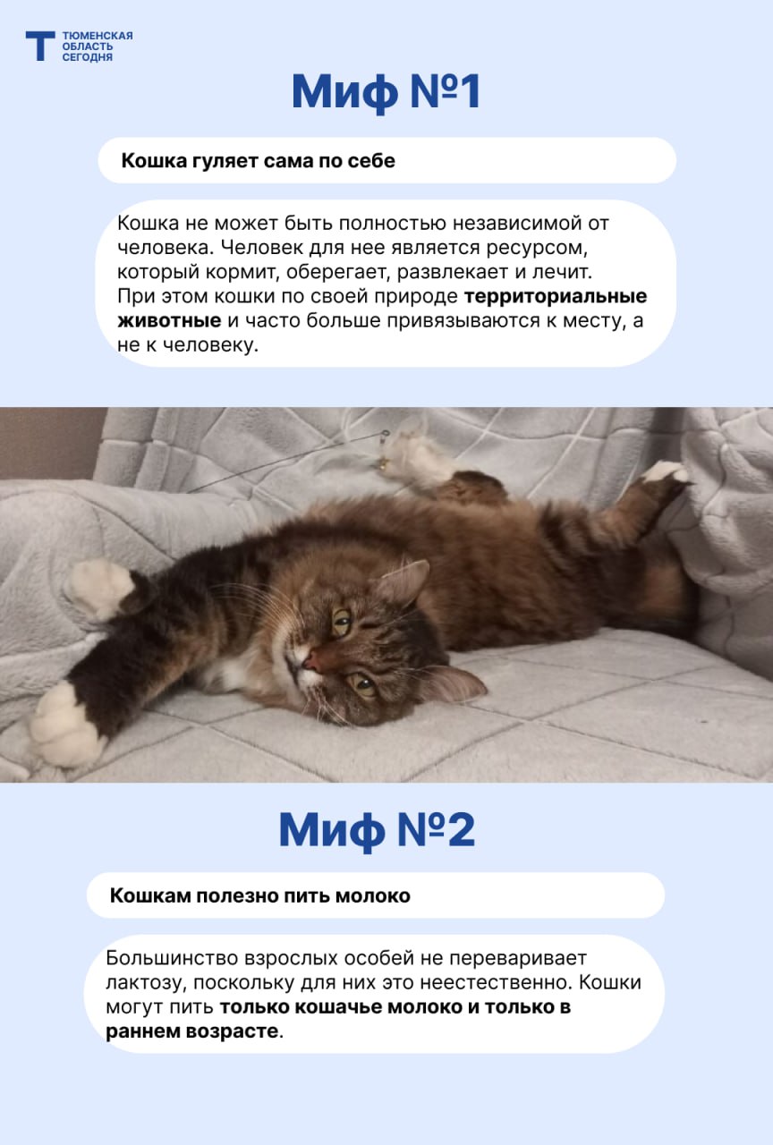 Тюменский зоопсихолог, фелинолог Дарья Шелудкова помогла разобраться в самых популярных заблуждениях о кошках. Читайте в карточках 10 мифов о кошках.