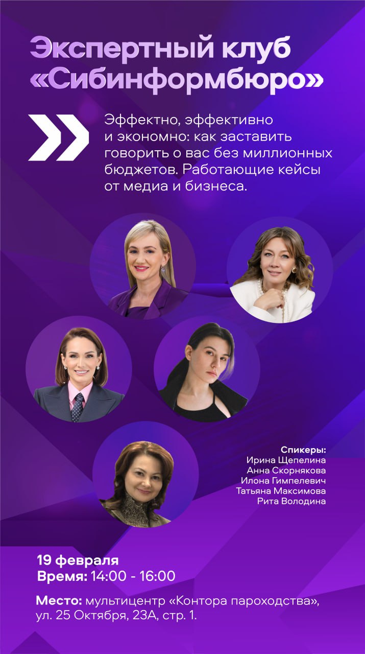 Приходите 19 февраля на встречу Экспертного клуба "Сибинформбюро". Тема: «Эффектно, эффективно и экономно: как заставить говорить о вас без гигантских бюджетов».