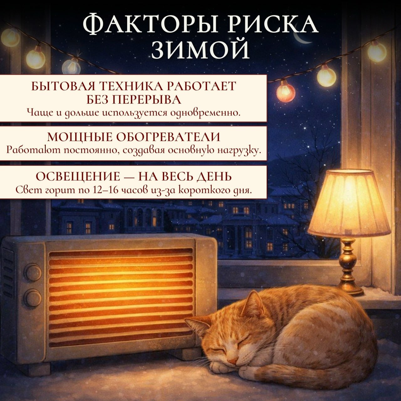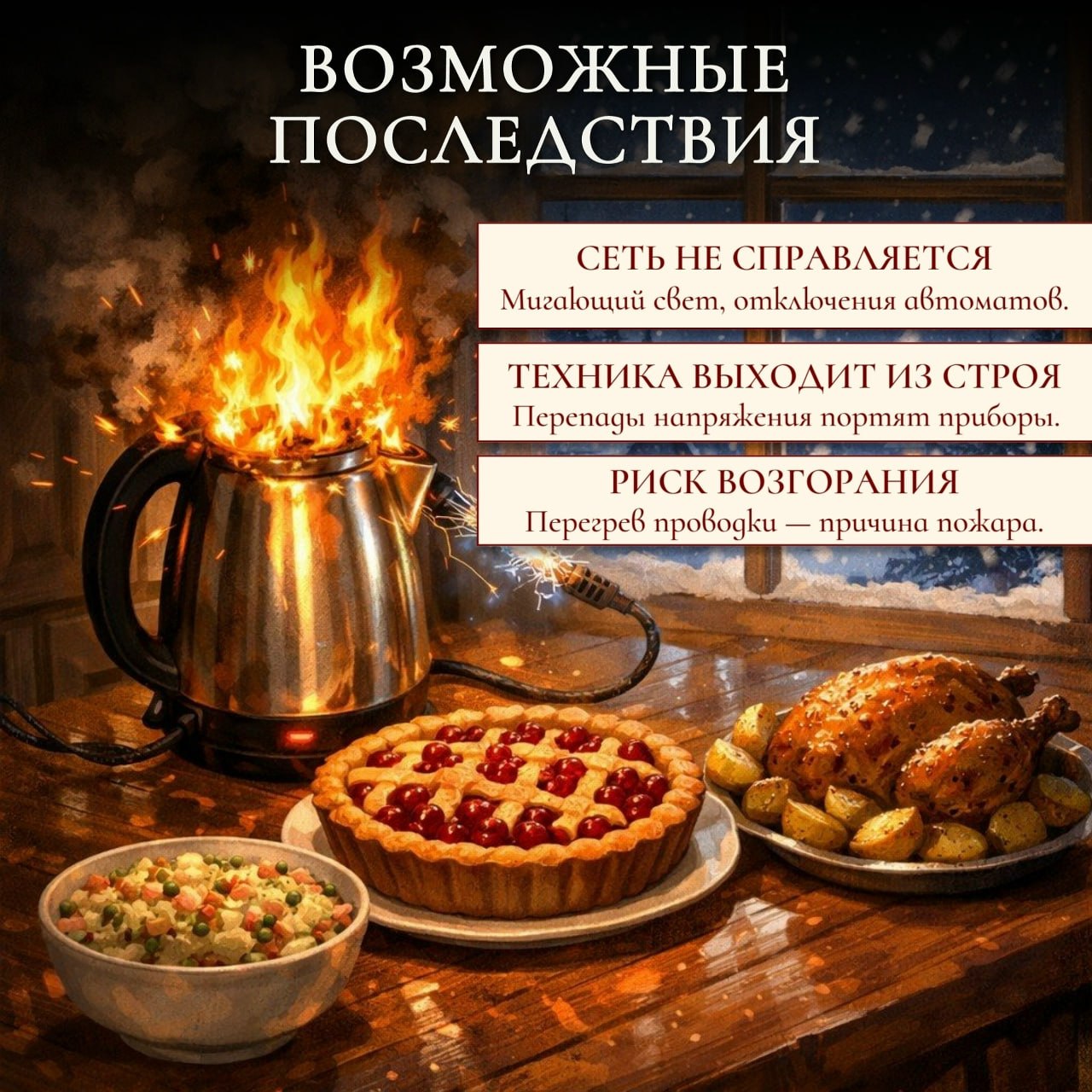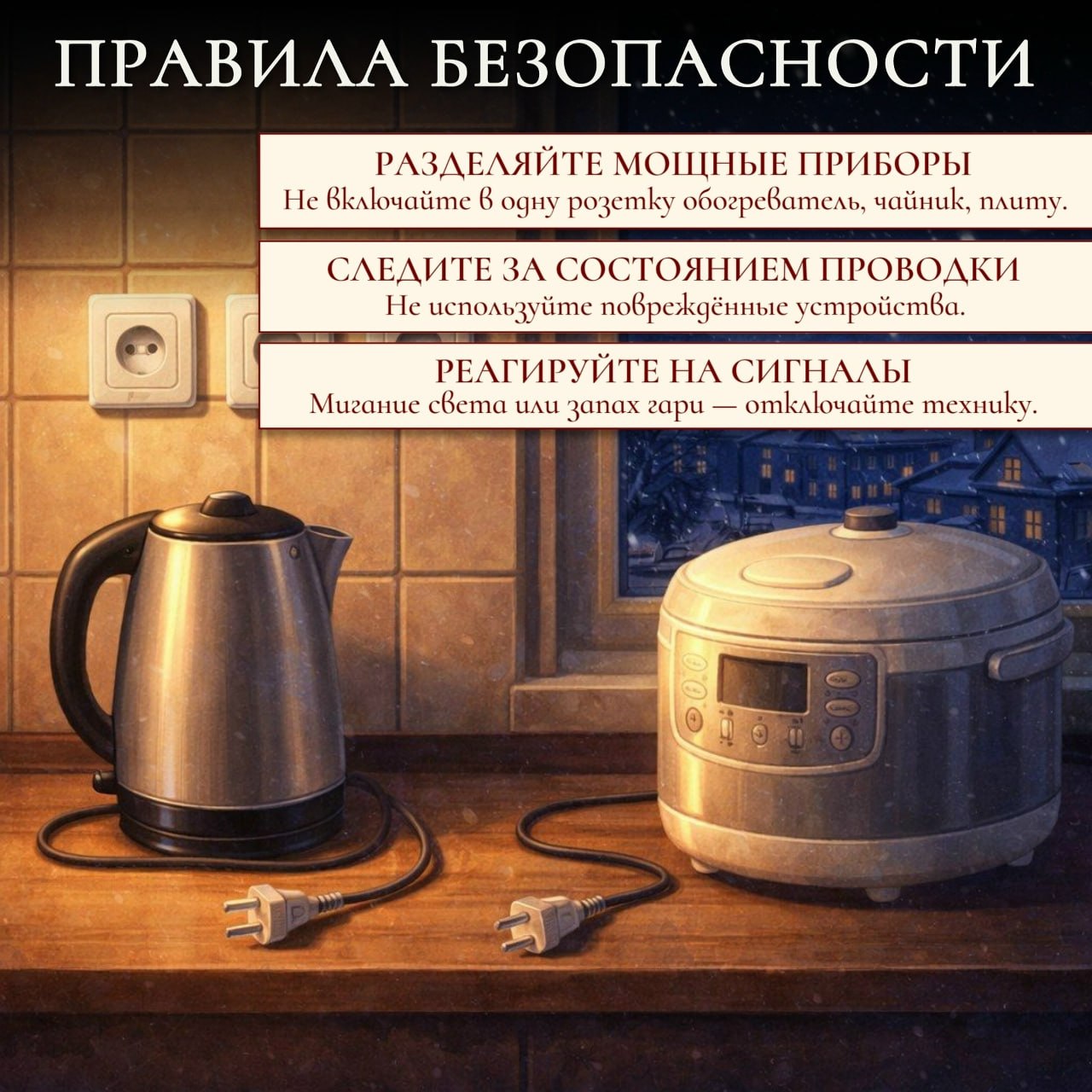 Одновременное использование обогревателей и кухонной техники создаёт пиковую нагрузку на домашнюю электросеть.