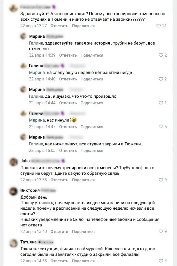 Клиенты Stretch House остались без тренировок и без денег. Одна из пострадавших, Дарья, потеряла доступ к 42 занятиям. Стоимость абонемента составила 23 600 рублей. Отмена тренировок произошла без предупреждения, деньги за абонемент не вернули, на сообщения и звонки в студии не отвечают.