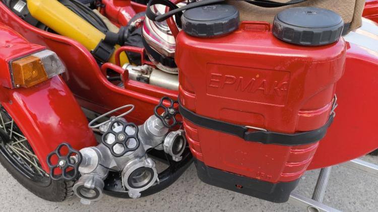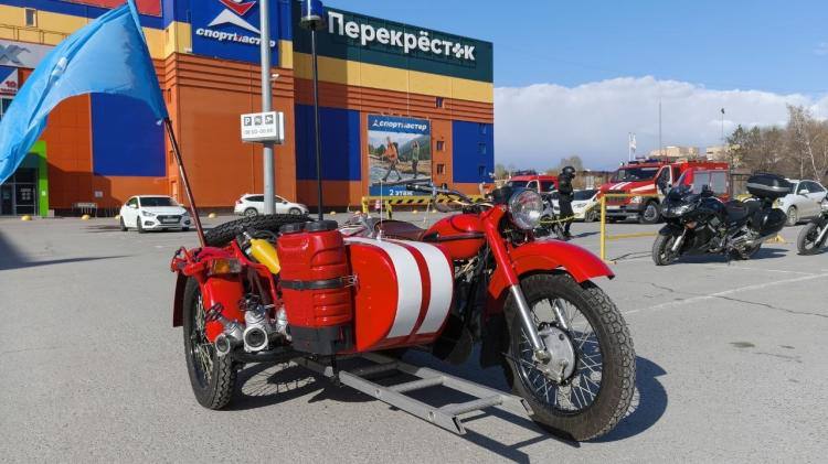 Во главе колонны ехал легендарный пожарный мотоцикл.
