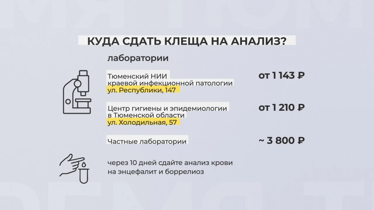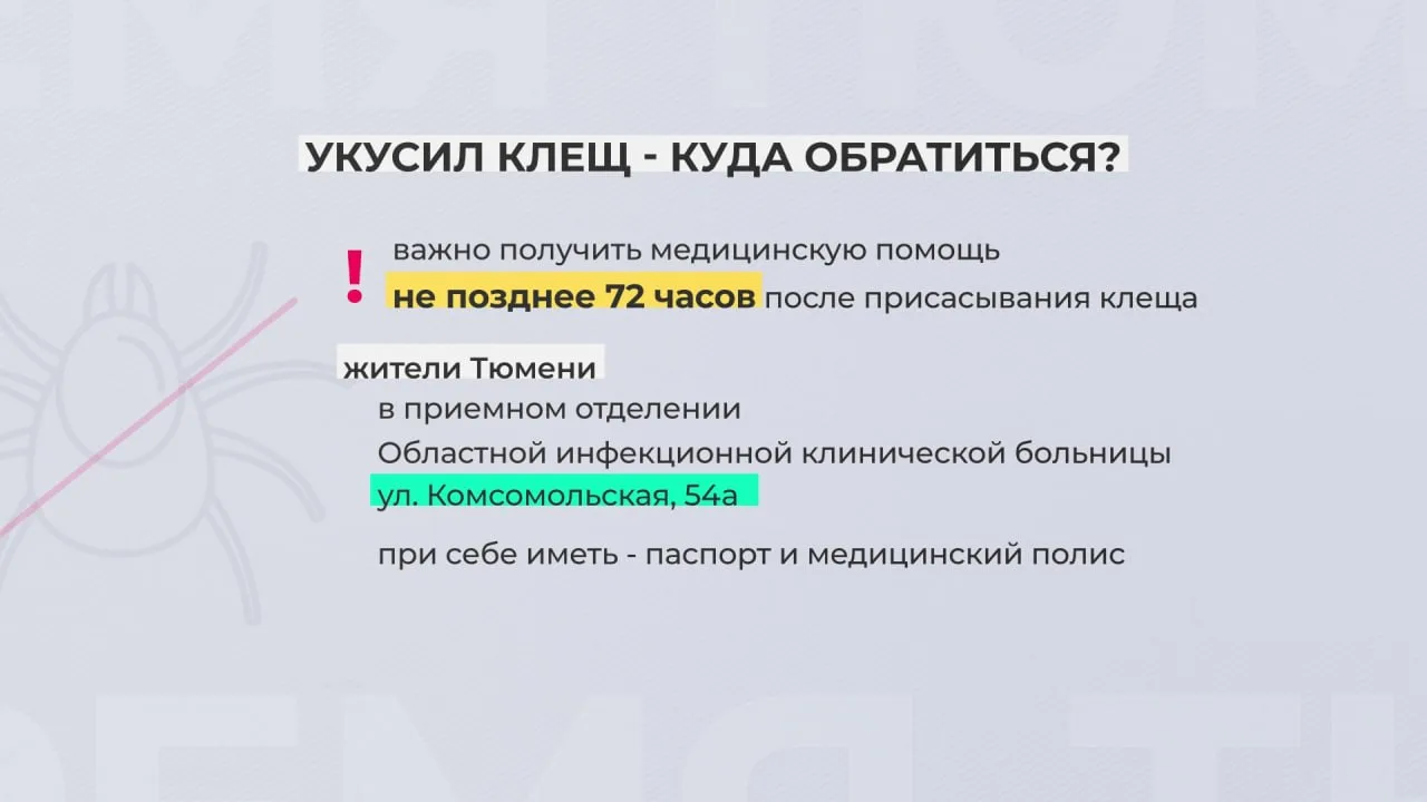 Напоминаем, если к вам присосался клещ, срочно обратитесь к врачу. Сделать это нужно в течение 72 часов. Тюменцы могут получить помощь в приёмном отделении Областной инфекционной клинической больницы по адресу улица Комсомольская, 54а. Приём круглосуточный. Жителей региона примут в областной больнице муниципального округа. Снятых клещей рекомендуют исследовать на наличие возбудителей инфекционных болезней. В Тюмени это можно сделать в НИИ краевой патологии и в Центре гигиены и эпидемиологии. Стоимость исследования от тысячи рублей. Кроме того, клеща на анализ принимают и частные лаборатории города. Через 10 дней необходимо сдать анализ крови на энцефалит и боррелиоз.