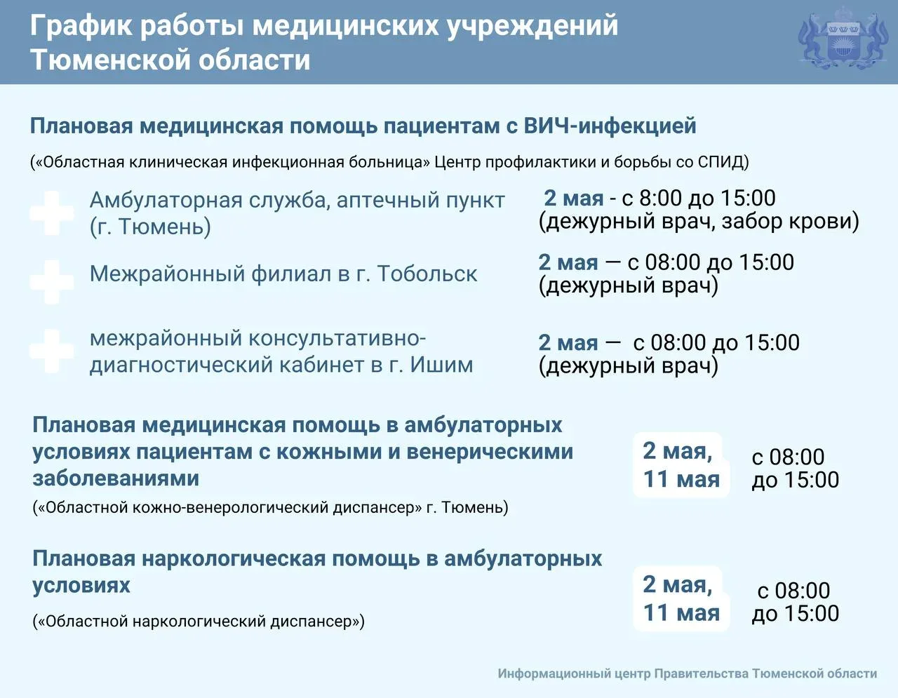 В Праздник весны и труда, а также в День Победы в медицинских учреждениях продолжится прием пациентов.Изменения режима работы смотрите в карточках. В остальные дни — работа по обычному графику.Информационный Центр правительства регионаМы в...