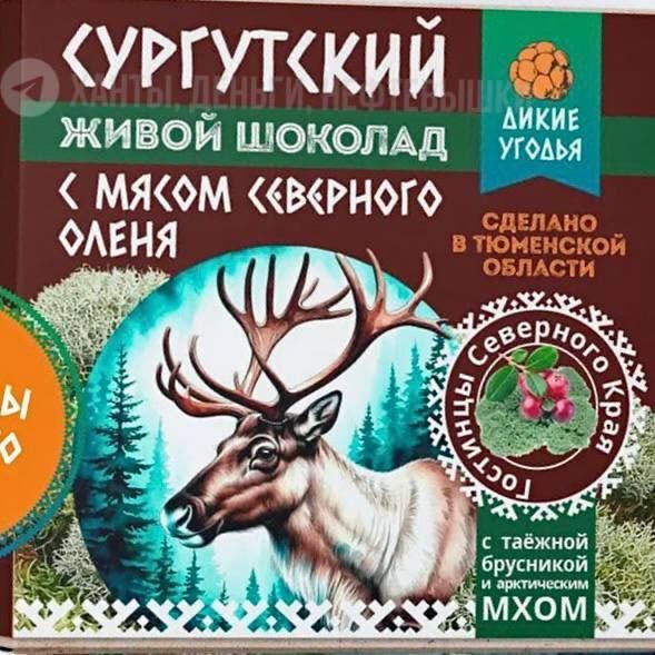 Плиточка «Живой» шоколадки весом 50 грамм стоит около 1000 рублей. Производят экзотику в Сургуте — в составе можно найти мясо северного оленя, арктический мох, таежную бруснику и мёдКак думаете...