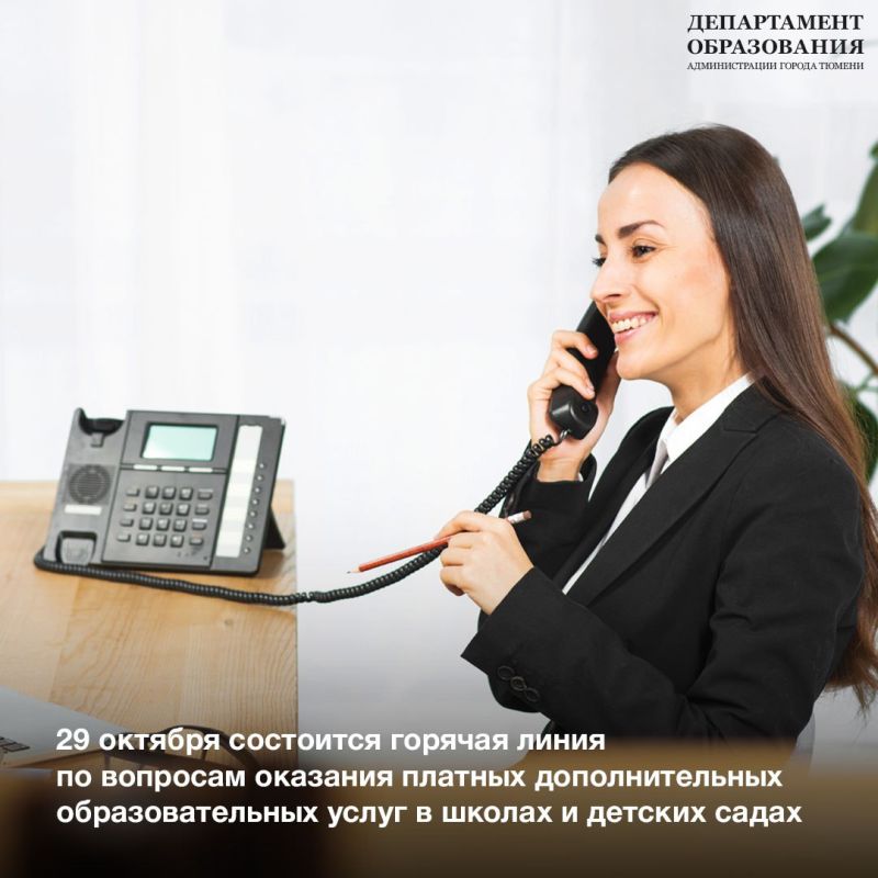 29 октября состоится горячая линия по вопросам оказания платных дополнительных образовательных услуг в муниципальных детских садах и школах Тюмени.На вопросы родителей готовы ответить специалисты городского департамента образования. Звонки принимаются...