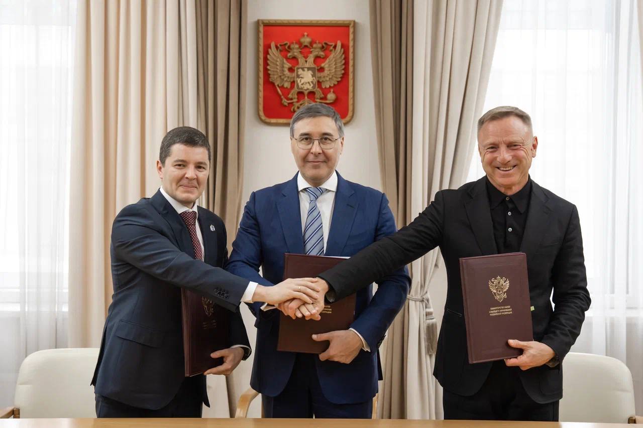 Министр науки и высшего образования Валерий Фальков, губернатор Ямало-Ненецкого автономного округа Дмитрий Артюхов и ректор Московского физико-технического института Дмитрий Ливанов заключили соглашение о взаимодействии.