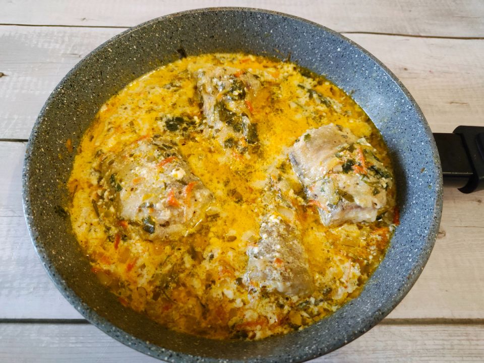 На сковороде с небольшим количеством растительного масла обжарить лук и морковь, добавив приправу для рыбы. Важно, чтобы овощи не подгорели, достаточно дождаться, пока они станут мягкими. После этого в сковороду выкладываются куски минтая, предварительно обваленные в муке. Этот шаг не только придаст блюду необходимую текстуру, но и предотвратит свёртывание сметаны во время готовки.