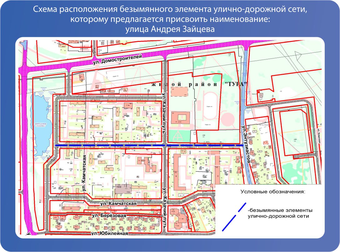 Комиссией по присвоению, изменению, аннулированию наименований элементов планировочной структуры и элементов УДС будет рассматриваться предложение о присвоении элементу улично-дорожной сети территории планировочного района № 7 «Гилевский» наименования: имени Зайцева Андрея Николаевича – участника специальной военной операции, награжденного орденами Мужества (посмертно), «За службу казачеству», медалями Жукова, «За усердие в службе». Предлагаемое наименование: улица Андрея Зайцева.