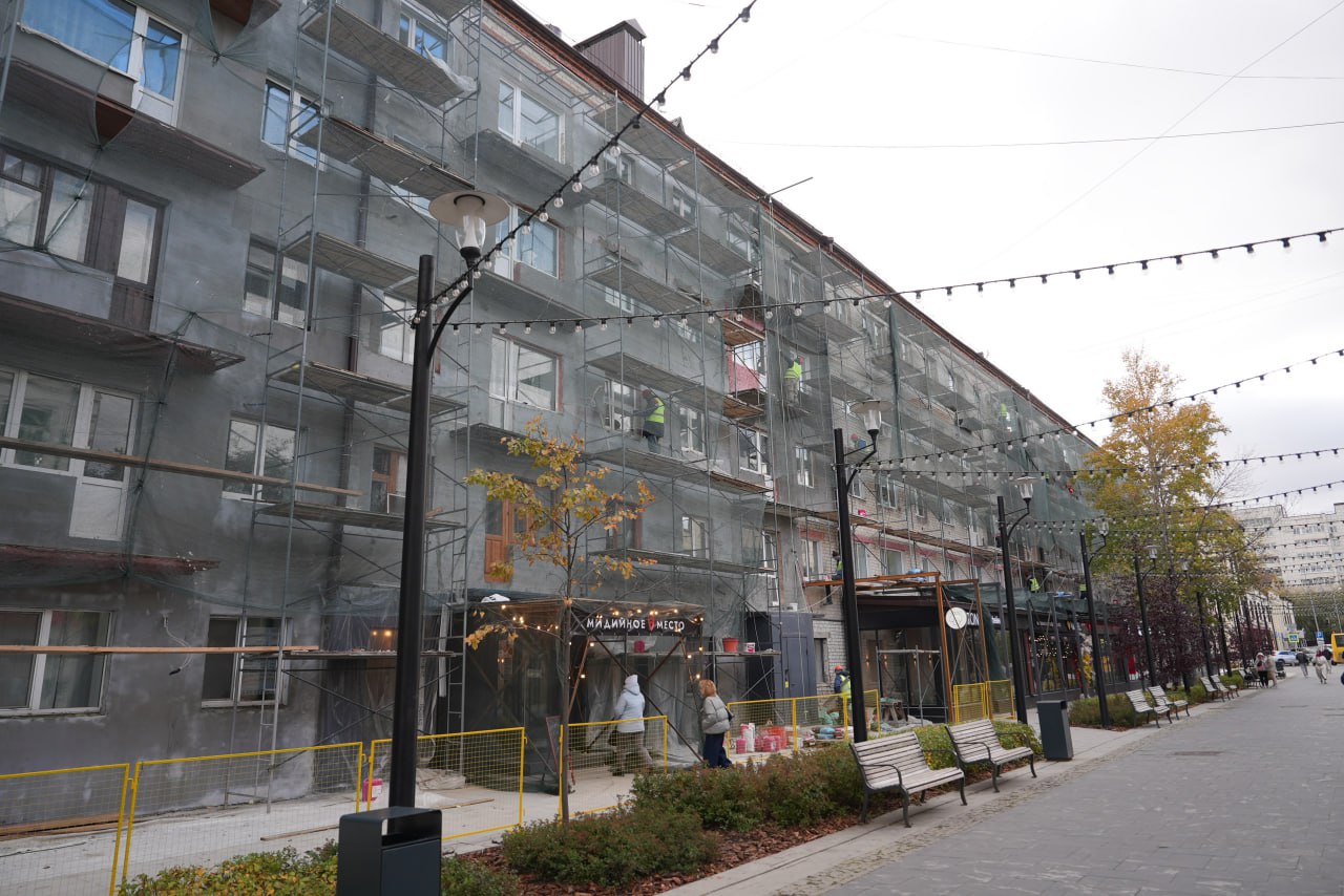 Особое внимание уделяется усилению конструкций балконных плит, ремонту входных групп, демонтажу и устройству спусков в подвал, а также монтажу архитектурной подсветки фасада.