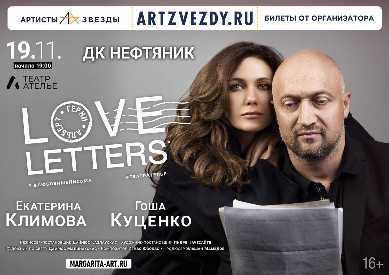 19 ноября в 19:00 во дворце культуры «Нефтяник» Гоша Куценко и Екатерина Климова представят спектакль Love letters. Спектакль «Любовные письма» - про мужчину и женщину, которые на долгие годы ведут романтическую переписку, это роман в письмах, длиною в жизнь.