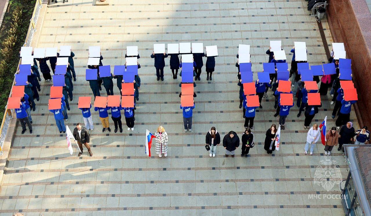 Более семидесяти человек, в том числе и представители Главного управления МЧС России по Тюменской области выстроились с табличками в цвет Государственного флага РФ. Своеобразный флэш-моб стал поздравительным посланием Владимиру Владимировичу Путину с его 73-летием.