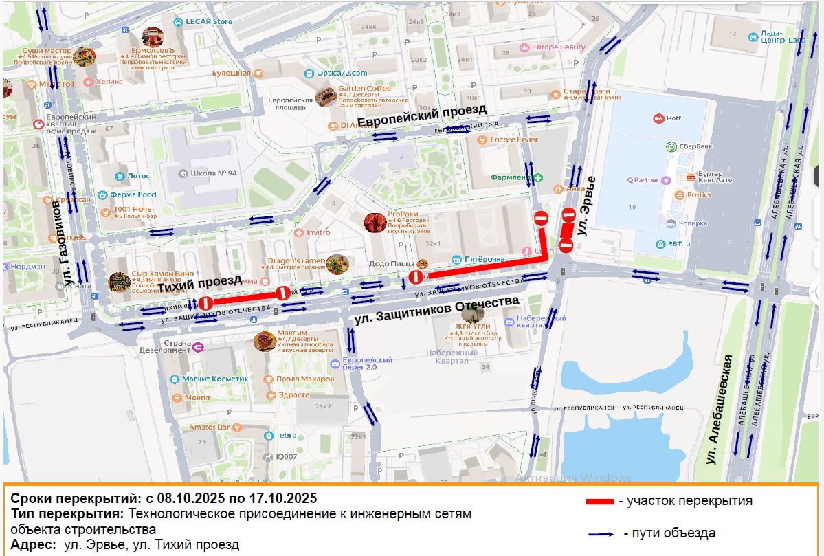 Напоминаем, что на период строительно-монтажных работ по строительству тепловой сети для подключения к системе теплоснабжения объекта капитального строительства «Многоэтажные жилые дома с объектами инфраструктуры в районе улиц Береговая – Мысовская – Газовиков города Тюмени» в целях производственной необходимости прекращено движение транспорта на автомобильной дороге по Тихому проезду в районе дома № 4 и дома № 32 корпус 1 по ул. Ю.-Р.Г. Эрвье с 08.10.2025 до 17.10.2025.