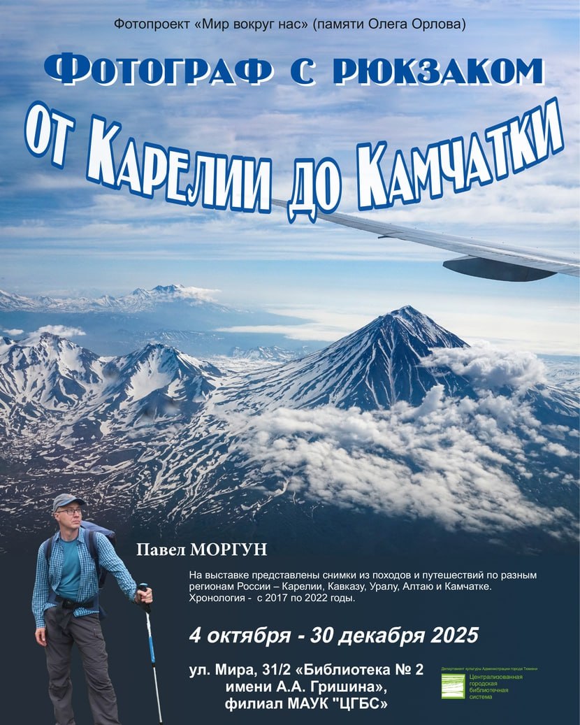 Автор снимков — Павел Моргун, редактор отдела фотоиллюстраций газеты «Тюменские известия». Это его первая персональная выставка, на которой он решил разместить фотоснимки из своих путешествий по России. В экспозиции представлены кадры из Карелии, Алтая, Кавказа, Урала, Камчатки.
