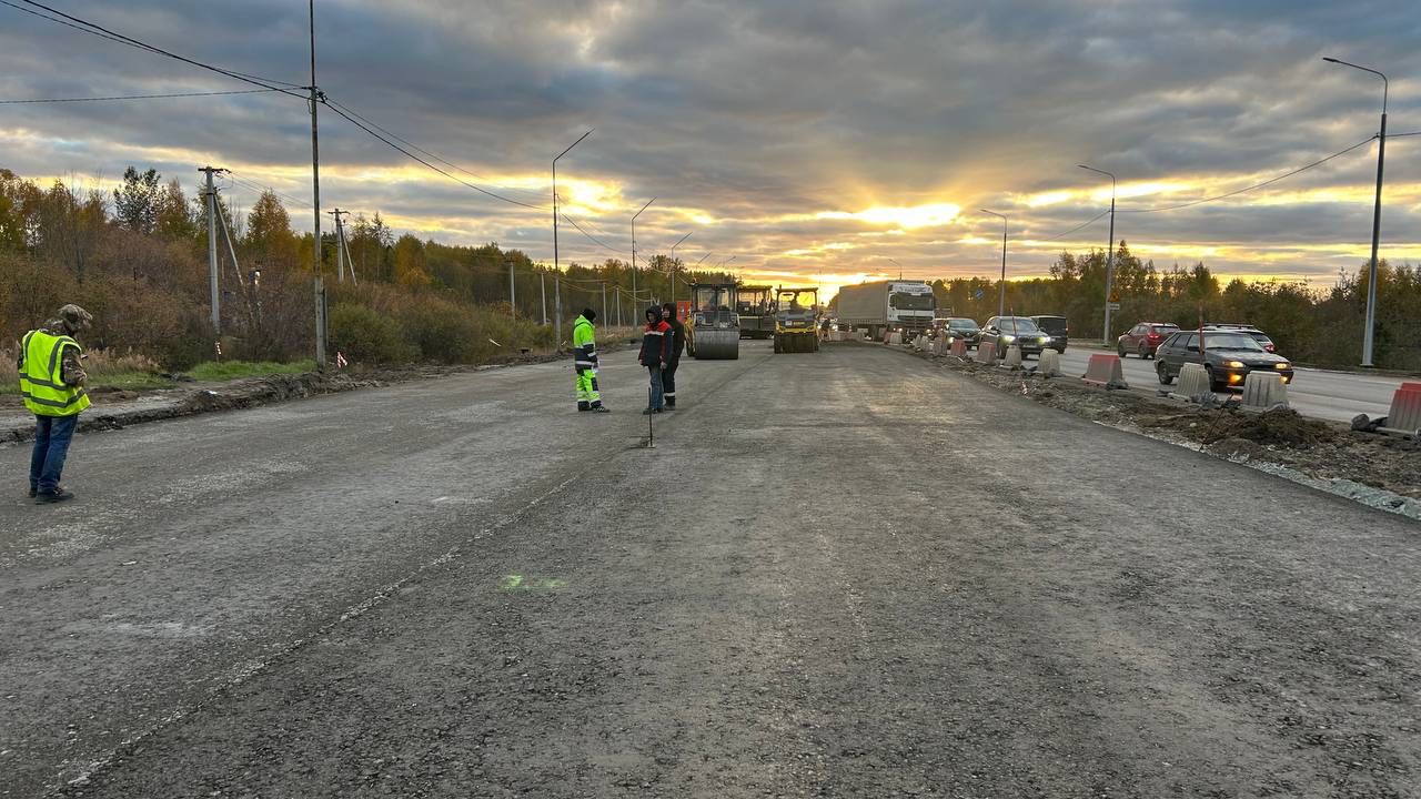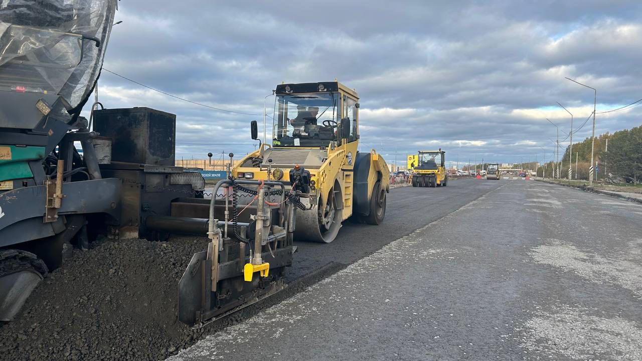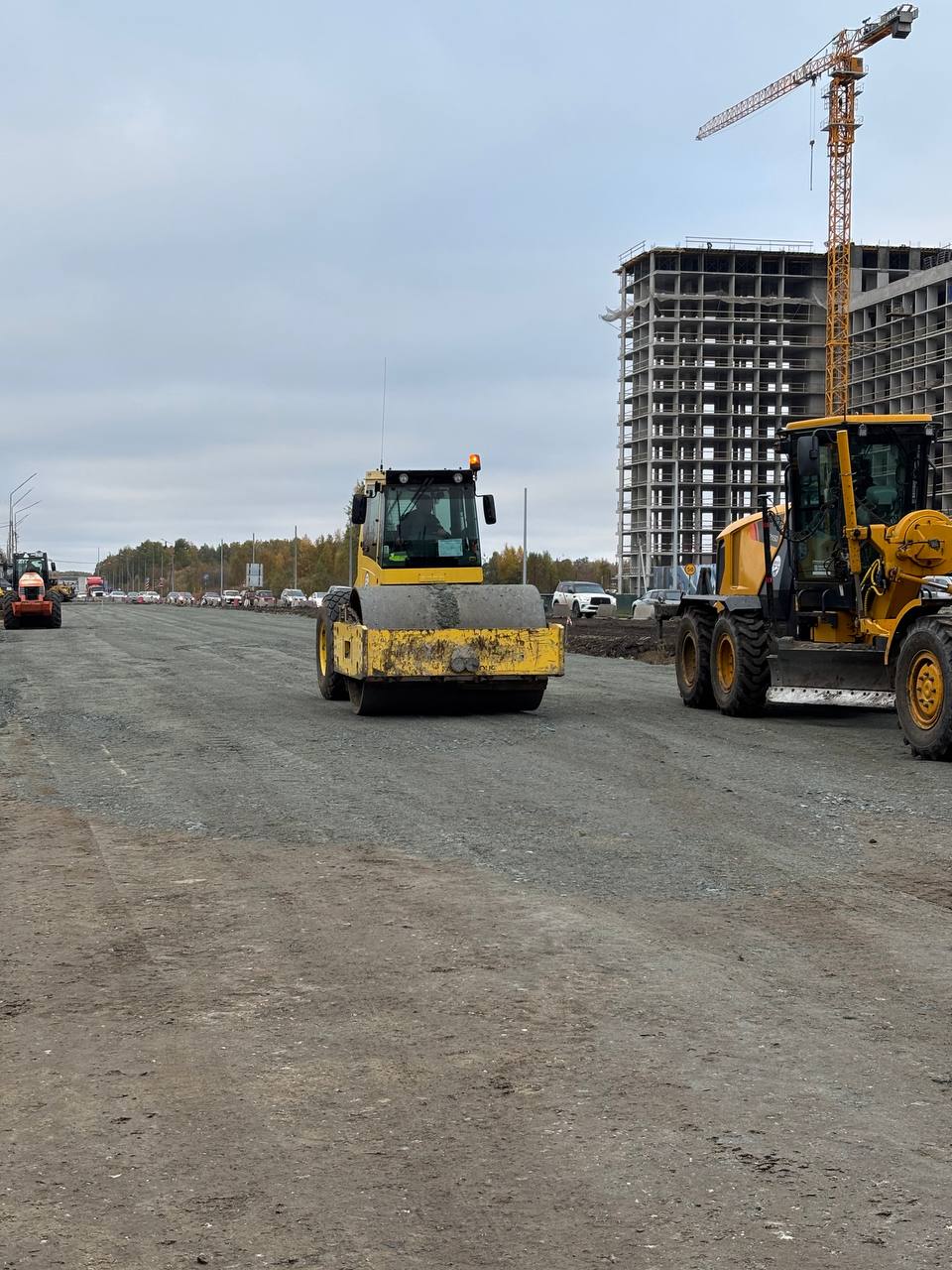 По оси №1 – из Тюмени в Екатеринбург протяжённость 750 метров, работы выполнены на 95 %. Осталось уложить верхний слой асфальтобетона, установить барьерные ограждения.