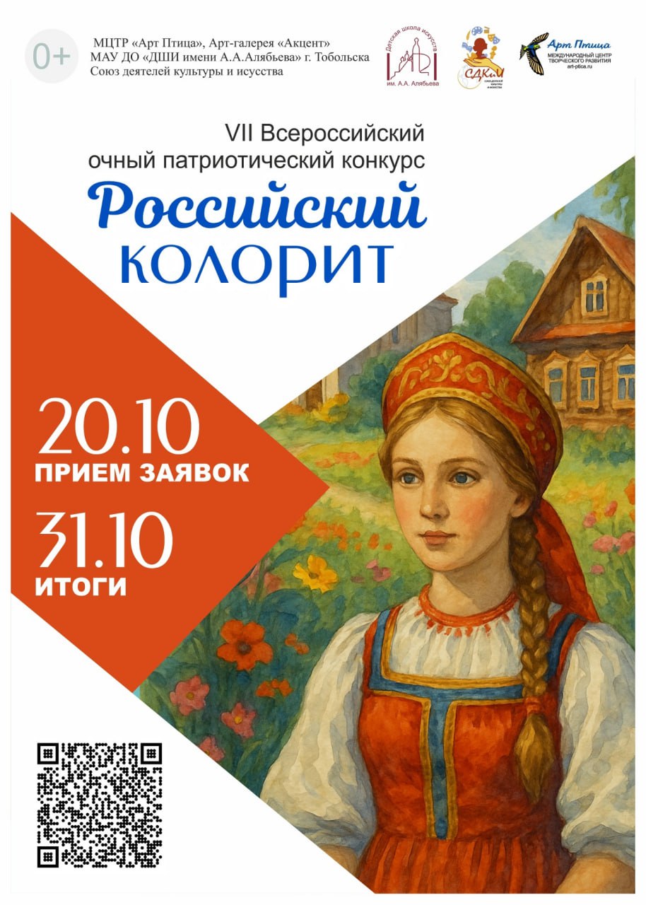 Внимание, творческие люди Тобольска! Открыт прием заявок на VII Всероссийский очный конкурс «Российский колорит»! Проявите свою любовь к Родине через искусство! Конкурс посвящен Дню народного единства и 80-летию Великой Победы.