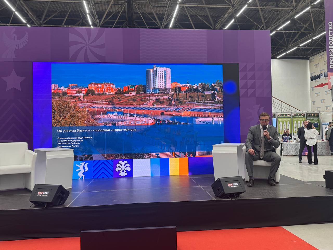 На сцене — Артём Павлюченко с важной темой «Об участии бизнеса в развитии городской инфраструктуры».