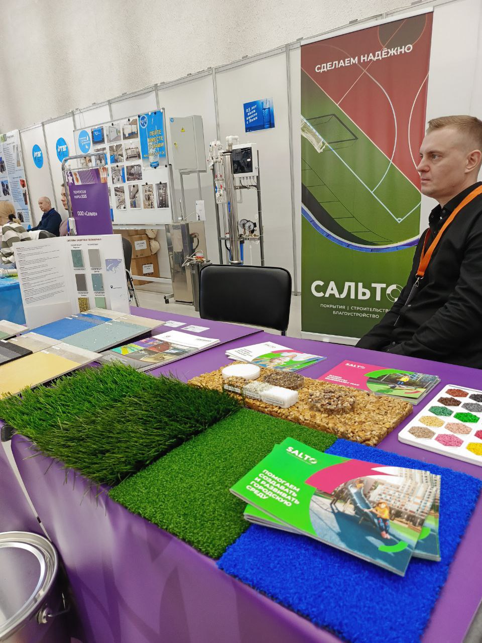 Сегодня один из участников выставки «Тюменская марка» представил покрытия для игровых, спортивных площадок, зон отдыха. Компания «Сальто» проектировала, производила и монтировала подобные в Ноябрьске, Новом Уренгое, Муравленко и в тюменском ЖК «Новин». В нашем городе компания создает бесшовные резиновые покрытия, каменные ковры, искусственную траву, резиновую плитку (в том числе для тротуаров), а также спортивный линолеум. Изделия устойчивы к износу, перепадам температур и интенсивным нагрузкам.