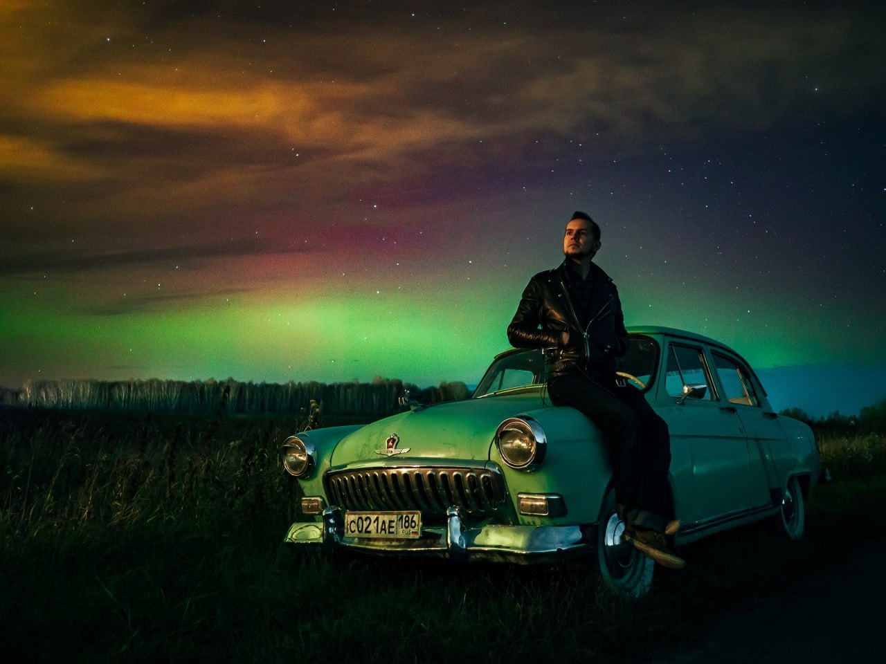 Охотник за северным сиянием на ретро Волге