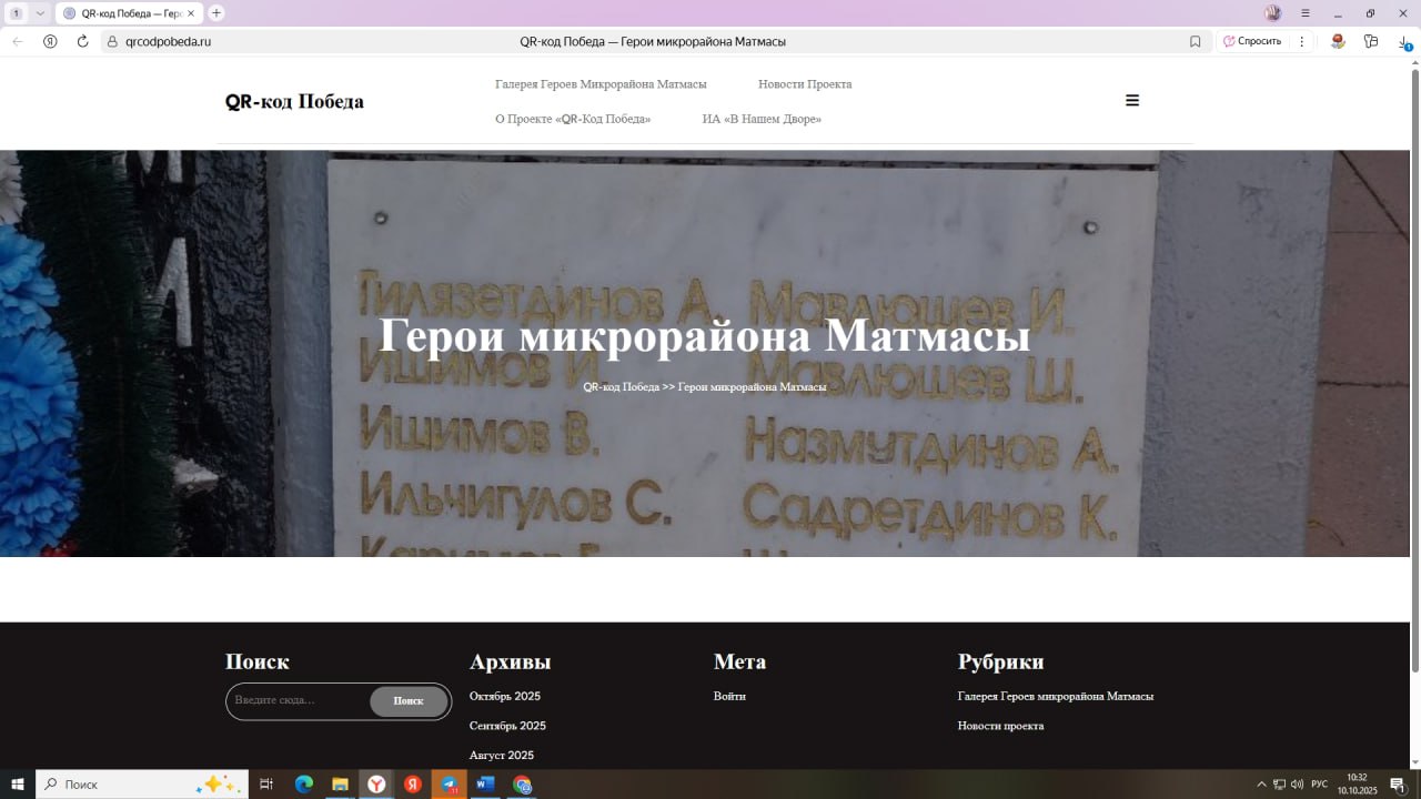 Прошел очередной этап. Собраны данные на Героев Великой Отечественной войны – жителей ж.р. Матмасы. Начато размещение этих сведений на специально созданном сайте https://qrcodpobeda.ru/ Завершается изготовление памятной стеллы. На базе библиотеки «Литера» прошли встречи «Герои Матмас».