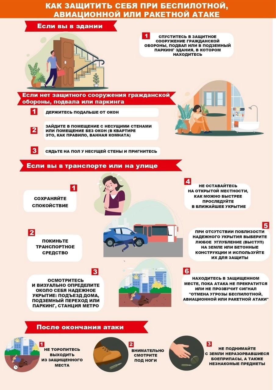 Как защитить себя при беспилотной, авиационной или ракетной атаке, если находитесь в здании, в транспорте или на улице, а также, что делать после окончания атаки, смотрите в памятке.