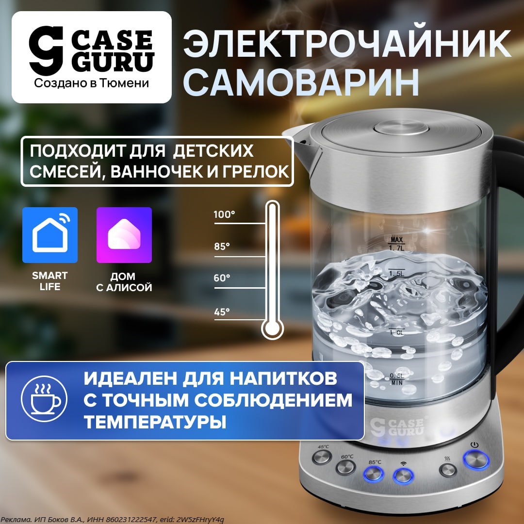 Умный чайник CaseGuru Самоварин быстро нагревает воду до заданной температуры: от 30 до 100 градусов. Иллюминаторное стекло чайника устойчиво к царапинам и лучше переживает накипь, чем аналоги.