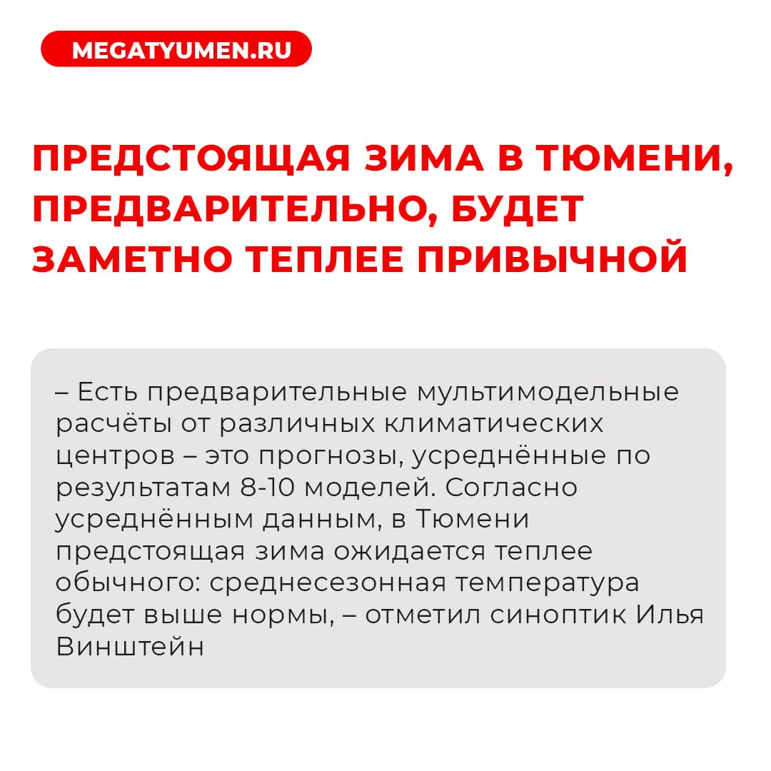 Предстоящая зима в Тюмени, по предварительным данным, будет заметно теплее привычной. Об этом «МегаТюмени» сообщил синоптик Илья Винштейн, ссылаясь на результаты мультимодельных расчётов, проведённых в ряде ведущих климатических центров.