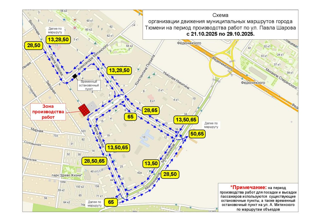 С 21 по 29 октября 2025 года в связи с выполнением работ по ул. Павла Шарова маршруты №№ 13, 28, 50, 65 будут следовать в объезд перекрытого участка со всеми существующими остановочными пунктами по маршрутам объезда.