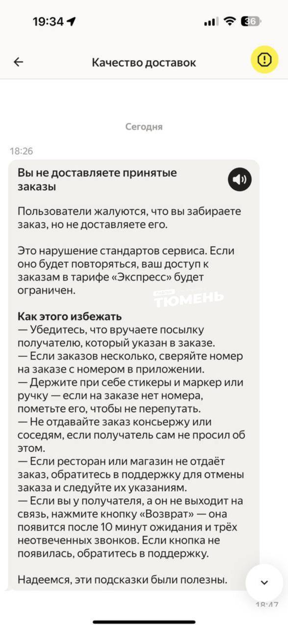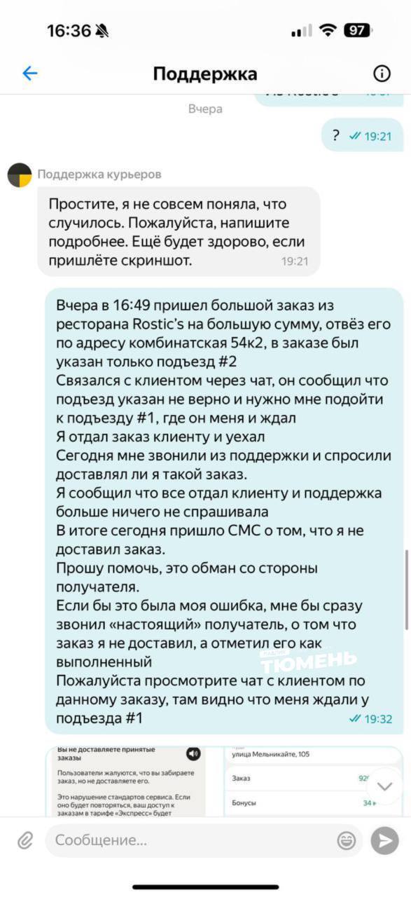 Среди примеров, заказ на адрес Полевая, 117к7. Туда девушка-курьер привезла заказ, вручила его клиенту, пожелала приятного аппетита и хорошего дня. А в ответ получила: «Вы не доставили взятый заказ» — от сервиса. Вдобавок с нее было списано 3 тысячи рублей