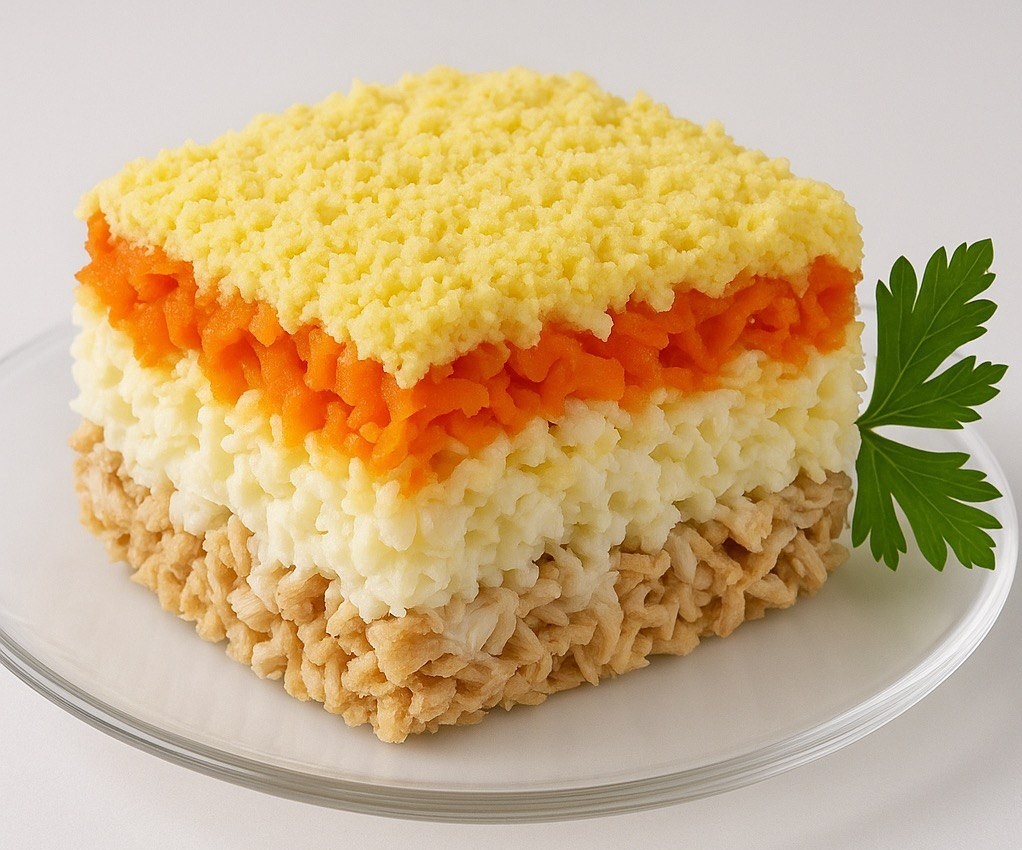 - Выкладывать на тарелку слоями: рыба, ложка майонеза, натертые белки, морковь с майонезом и, наконец, посыпать желтками.