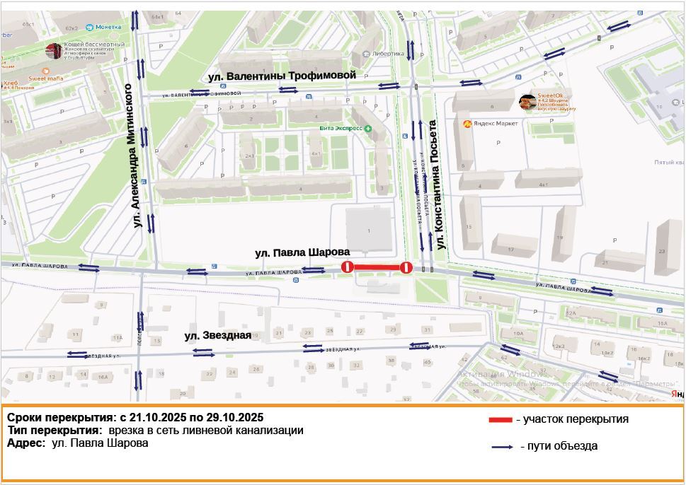 Возможные маршруты объезда по улицам: Константина Посьета, Александра Митинского, Звездная, Валентины Трофимовой.