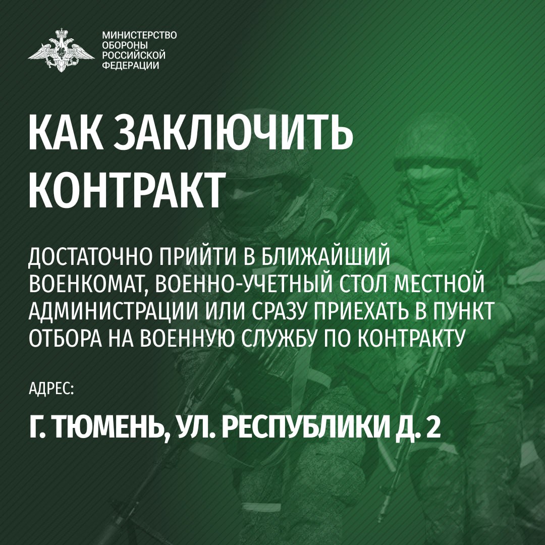 3 400 000 получают граждане, заключившие контракт с Минобороны РФ в военкоматах Тюменской области либо в пункте отбора на военную службу по контракту города Тюмени (ул. Республики, 2/1).