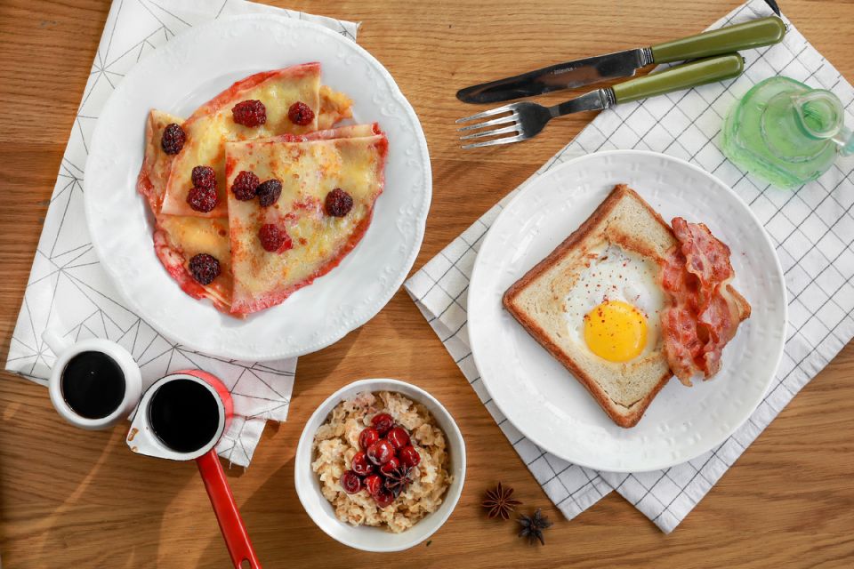 Первым делом на повестке дня — тост с яичницей и беконом. В середине ломтиков хлеба следует вырезать кружок, затем на сковороде растопить 10 граммов сливочного масла, добавив каплю растительного для профилактики подгорания. После этого хлеб обжаривается по минуте с каждой стороны, а затем в получившееся «окно» разбивается яйцо. Яичницу стоит готовить на слабом огне, а рядом подрумянить бекон.