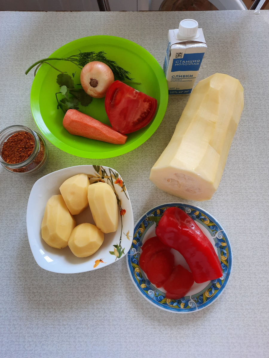 Приготовление начинается с кипячения 2 литров воды. В кипящую воду добавляют порезанный картофель, лук, морковь и болгарский перец, варят до готовности картошки. В это время кабачок и две придавленные дольки чеснока слегка обжариваются на сливочном масле. Когда овощи готовы, в суп добавляется обжаренный кабачок, помидор и острый перец. По желанию можно приправить карри или хмели-сунели для дополнительного аромата. После пяти минут варки суп взбивается до состояния пюре, затем добавляются сливки. Перед подачей суп рекомендуется посыпать свежей зеленью и черным перцем.
