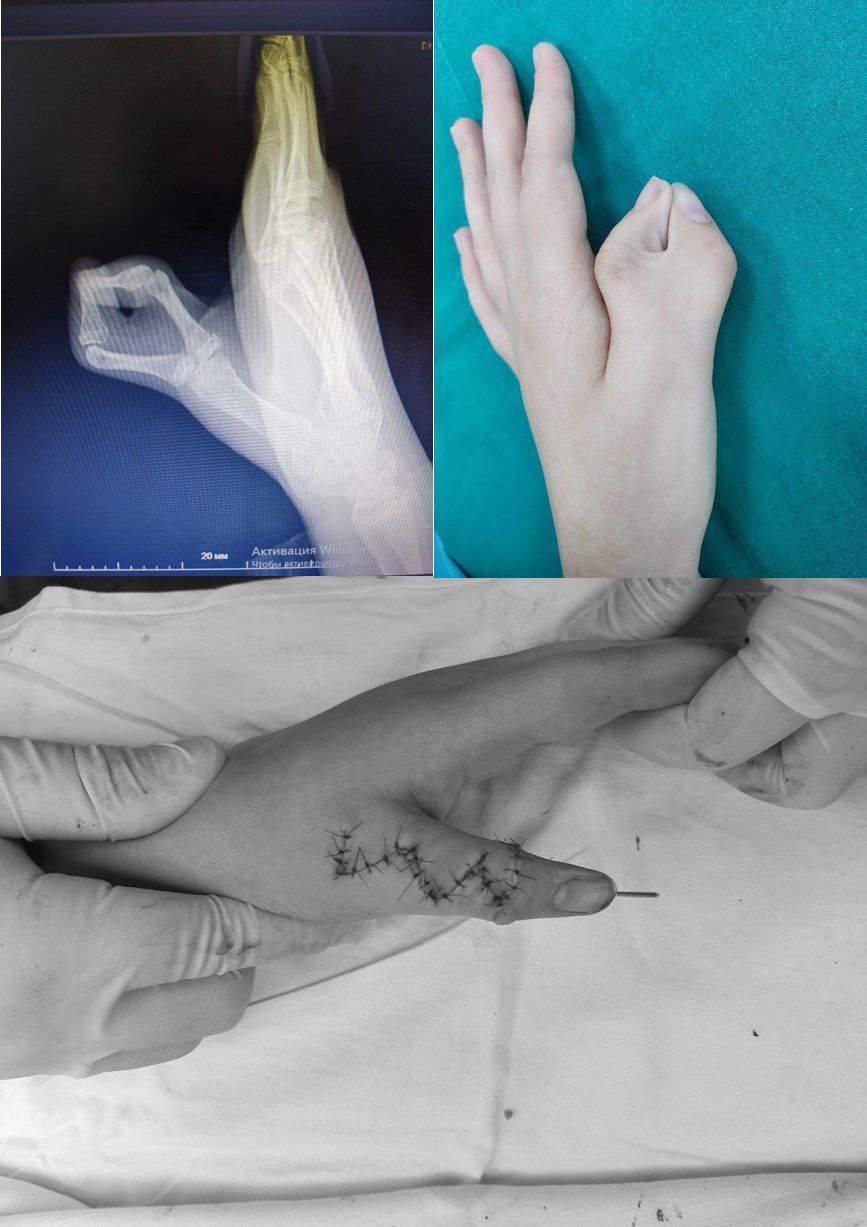 «Мы удалили добавочный палец. Стабилизировали пястно-фаланговый сустав. Скорректировали ось фаланги, зафиксировав спицей. Также перенесли точку фиксации длинного сгибателя для профилактики рецидива деформации пальца», — рассказал травматолог-ортопед детского стационара ОКБ №2 Игорь Супрунов.